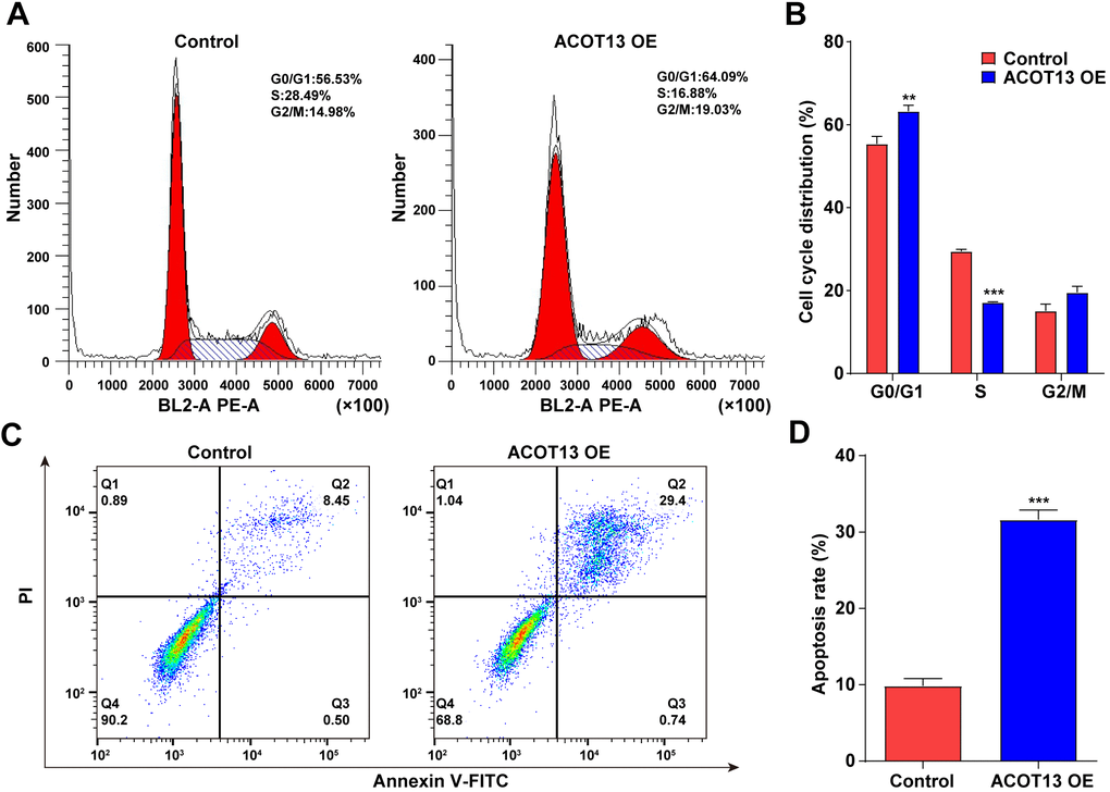 We further explored the effects of ACOT13 on the cell cycle and apoptosis in WT9-12 cells. As revealed in Figure 5A, 5B, compared with control group (~55%), the percentage of WT9-12 cells in the G0/G1 phase increased to ~ 63% after transfection with ACOT13 OE. Meanwhile, the percentage of ACOT13 OE-transfected WT9-12 cells in the S phase declined to ~ 17% compared with control group (~29%) (Figure 5A, 5B). Collectively, ACOT13 overexpression could lead to an increase in the G0/G1 phase population, but a reduction in the S phase population in WT9-12 cells, suggesting that ACOT13 overexpression could induce cell cycle arrest at G0/G1 phase. Additionally, ACOT13 overexpression obviously elevated the percentage of apoptotic cells (~32%) compared with control group (~10%), indicating that ACOT13 could trigger WT9-12 cell apoptosis (Figure 5C, 5D). To sum up, ACOT13 could induce WT9-12 cell cycle arrest and apoptosis.