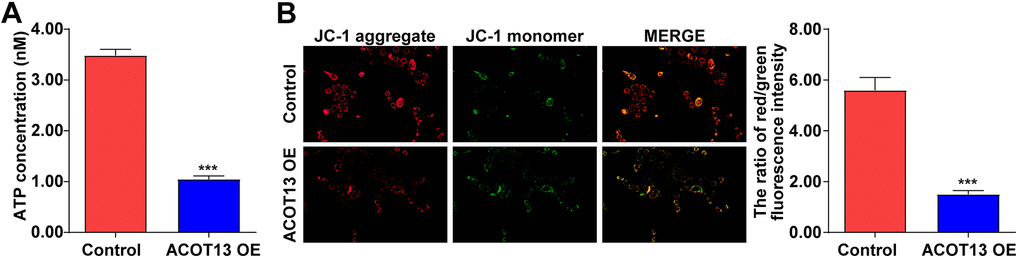 Mitochondria could provide cellular energy for cell growth through the generation of ATP [24, 25]. When mitochondria are damaged, a decreased ATP production and a loss of MMP were observed in damaged cells [26]. Thus, we explored the effect of ACOT13 on mitochondria function in WT9-12 cells. As indicated in Figure 6A, compared with control group, the ATP level was reduced by 70% in ACOT13 OE-transfected WT9-12 cells, indicating that overexpression of ACOT13 could decline the ATP level in WT9-12 cells. Additionally, upregulation of ACOT13 obviously reduced the MMP level in WT9-12 cells compared to control group (Figure 6B). These results illustrated that forced expression of ACOT13 could induce mitochondria damage in WT9-12 cells.