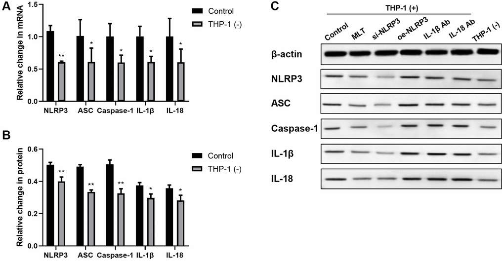 A549, THP-1 and primary human lymphatic endothelial cells (LECs) were acquired from Procell Life Science and Technology Co., Ltd. (Hubei, China). A549 cells were incubated in Dulbecco’s modified Eagle’s medium, containing 10% fetal bovine serum (FBS; Procell Life Science and Technology Co., Ltd., Hubei, China). THP-1 was grown in RPMI-1640 medium containing 10% FBS. LECs were incubated in Endothelial Cell Medium with 10% FBS, and 1% endothelial cell growth factors. All media were sourced from Procell Life Science and Technology Co., Ltd., Hubei, China, and all cells were placed in a 37°C humid chamber with 5% CO2 and 95% air. A549 cells were incorporated with NLRP3 siRNA or overexpression vector, prior to co-culture with THP-1. Additionally, the A549/THP-1 co-culture systems were treated in advance with melatonin (100 μmol/L), as well as the IL-1β (IL-1β Ab) and IL-18 antibodies (IL-18 Ab).