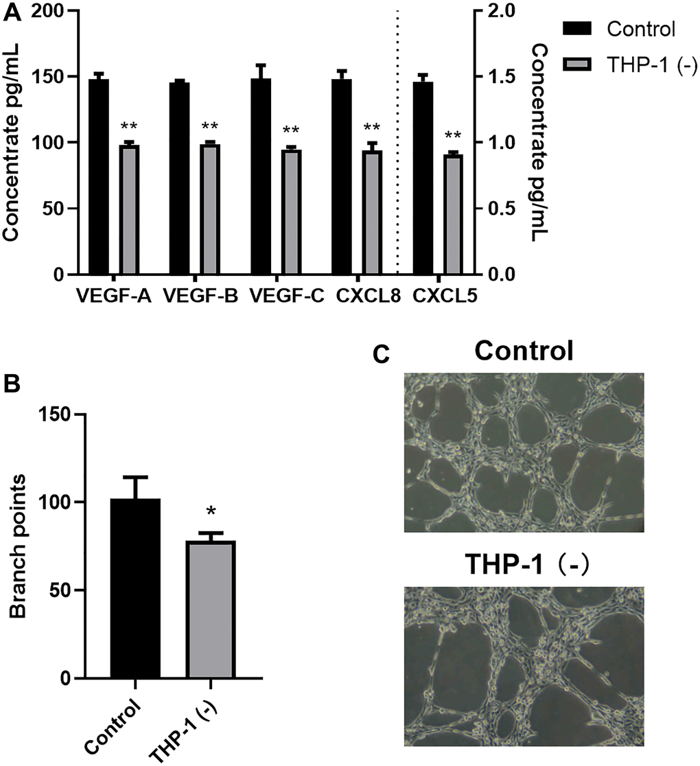 To explore the THP-1 macrophage-mediated regulation of tumor neovascularization and lymphangiogenesis, we next examined the VEGF and CXCL chemokine protein expressions. Following a 24-h A549 co-culture with/without THP-1 macrophage, we assessed the VEGF-A, VEGF-B, VEGF-C, CXCL5, and CXCL8 contents in the supernatant using ELISA. Relative to the A549 cells, the VEGF-A, VEGF-B, VEGF-C, CXCL5, and CXCL8 contents were markedly enhanced in the A549/THP-1 co-culture system (Figure 2A). Subsequently, we assessed the tube forming ability of LECs to examine whether THP-1 macrophages directly act on human LECs to promote lymphangiogenesis. We revealed that tube formation was strongly upregulated in the A549/THP-1 co-culture supernatants, relative to the untreated A549 culture supernatants (Figure 2B, 2C).