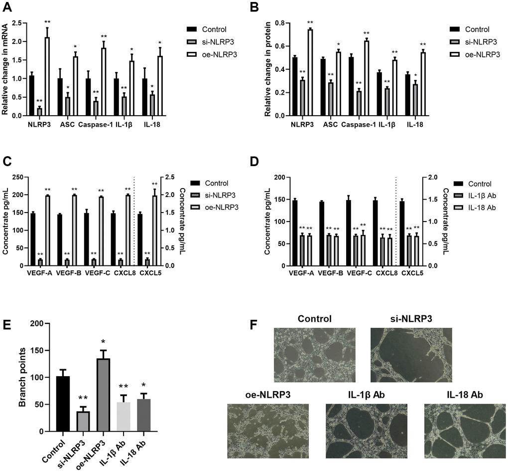 Inflammation is a strict angiogenesis and lymphangiogenesis regulator [19]. Hence, we next explored the association between the NLRP3 axis and angiogenesis/lymphangiogenesis. Using NLRP3 overexpression or si-NLRP3 vector in A549 cells, we revealed that NLRP3 transcript and protein expressions, as well as downstream inflammatory cytokine (IL-1β and IL-18) expressions were significantly enhanced (oe-NLRP3) or decreased (si-NLRP3), as expected (Figure 3A, 3B). Additionally, we revealed that si-NLRP3 markedly diminished VEGF and CXCL chemokine contents, as well as LECs tube formation, whereas, oe-NLRP3 enhanced those effects (Figure 3C–3F). To elucidate whether the NLRP3 downstream signaling contributes to angiogenesis and lymphangiogenesis, we next treated the A549/THP-1 co-culture system with IL-1β Ab and IL-18 Ab. Based on our results, both IL-1β Ab and IL-18 Ab strongly suppressed VEGF and CXCL chemokine expressions, as well as LECs tube formation (Figure 3D–3F). This evidence suggested that NLRP3 stimulated TME-related angiogenesis and lymphangiogenesis using the inflammasomal axis and downstream cytokines (IL-1β and IL-18).