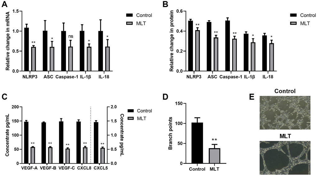 In a prior investigation, we revealed that melatonin strongly inhibited inflammatory responses via its suppression of the NLRP3 inflammasomal axis [17]. Therefore, herein, we investigated the melatonin-mediated regulation of the NLRP3-modulated angiogenesis and lymphangiogenesis. To this end, we co-cultured A549 and THP-1 for 24 h with melatonin (100 μmol/L), and examined the expression levels of the NLRP3 axis. Relative to controls, melatonin strongly prevented NLRP3 inflammasomal axis mRNA and protein expressions (Figure 4A, 4B). We further assessed the melatonin-mediated regulation of angiogenesis and lymphangiogenesis. Based on our VEGF and CXCL ELISA data, melatonin induced a substantial decrease in the aforementioned proteins (Figure 4C). Furthermore, in the co-culture system, melatonin strongly inhibited LEC tube formation, relative to controls (Figure 4D, 4E). Together, these data suggested that melatonin suppressed TME angiogenesis and lymphangiogenesis, at least partly, via inhibition of the NLRP3 inflammasomal axis.