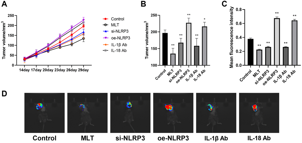 Further, we established a subcutaneous tumor model of Lewis Lung Carcinoma (LLC) cells in mice. In order to investigate the influence of melatonin on the NLRP3 pathway, we established the melatonin group (MLT), the NLRP3 overexpression group (oe-NLRP3), the NLRP3 knockdown group (si-NLRP3), the IL-1β antibody group (IL-1β Ab), and the IL-18 antibody group (IL18-Ab). We monitored the growth of subcutaneous tumors in mice. The study revealed that with increasing incubation time, significant differences in the volume of subcutaneous tumors were observed among the various groups compared to the control group (Figure 5A). Measurement of tumor volume after 30 days showed that compared to the control group, the subcutaneous tumor volume significantly decreased in the MLT group, si-NLRP3 group, and IL-1β Ab group, while it significantly increased in the oe-NLRP3 group and IL-18 Ab group (Figure 5B). In vivo fluorescence imaging also indicated that the average fluorescence intensity significantly decreased in the MLT group, si-NLRP3 group, and IL-1β Ab group, whereas it significantly increased in the oe-NLRP3 group and IL-18 Ab group (Figure 5C, 5D). The results of the IL-18 antibody group may be due to the dual role of IL-18 in tumor growth in the in vivo model, and its potential regulation by other pathways. Therefore, in subsequent experiments, we did not include the IL-18 ab group.