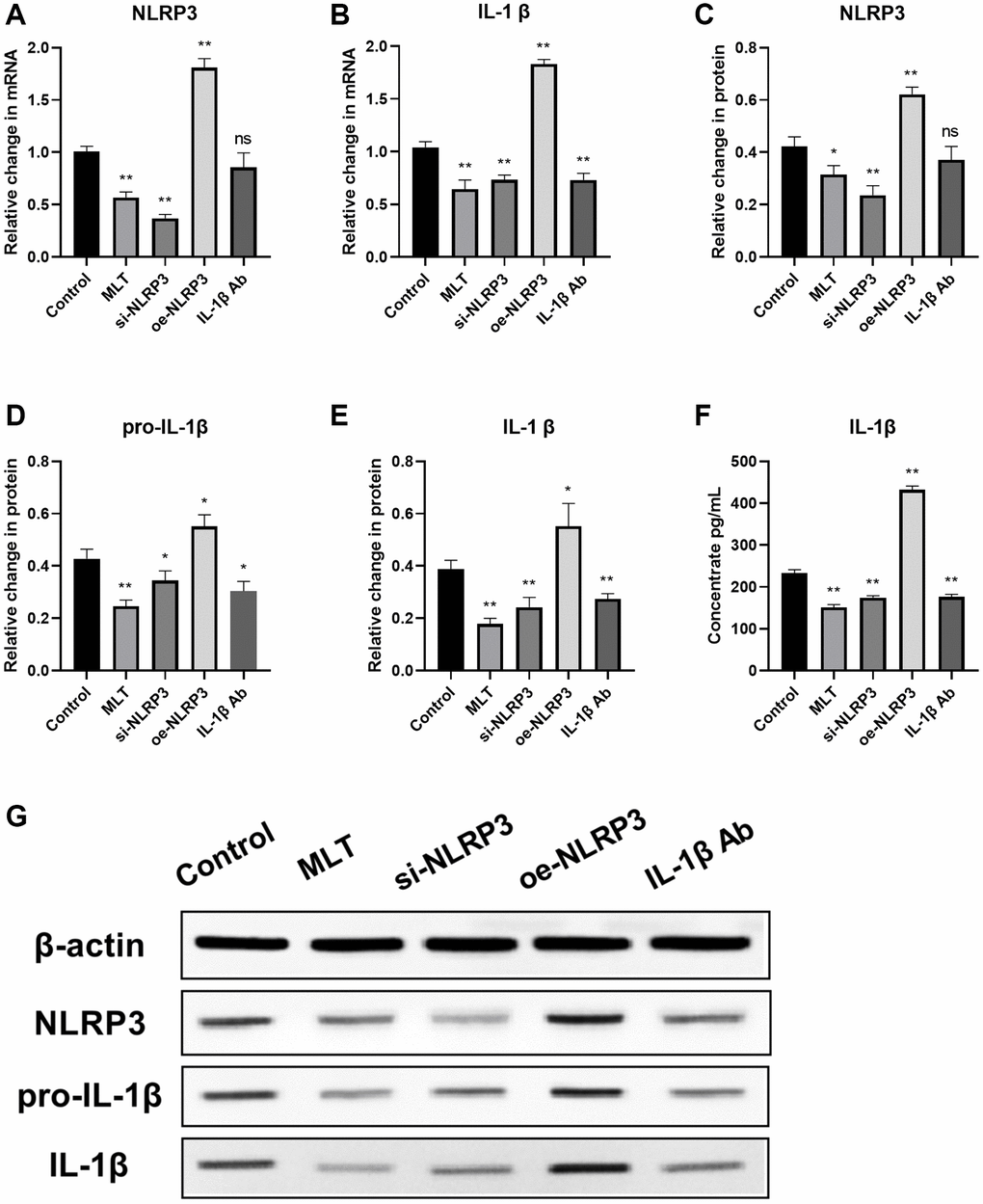 Then we investigated the regulatory effect of melatonin on the NLRP3 pathway in vivo. After 30 days of incubation, mice were euthanized and tumor tissue specimens were harvested. The mRNA and protein levels of NLRP3 pathway in the tumor tissues of each group were evaluated using RT-PCR and western blotting, respectively. Our findings indicate that both MLT group and si-NLRP3 group significantly suppressed the mRNA and protein expression levels of NLRP3 and downstream IL-1β in tumor tissues. Conversely, the oe-NLRP3 group exhibited opposite results. In the IL-1β Ab group, the mRNA and protein expression levels of IL-1β were suppressed (Figure 6A–6F). Meanwhile, we assessed the expression of IL-1β in the peripheral blood of mice. The results showed that the expression levels of IL-1β were significantly decreased in the MLT group, si-NLRP3 group, and IL-1β Ab group, while the oe-NLRP3 group exhibited opposite results (Figure 6G).