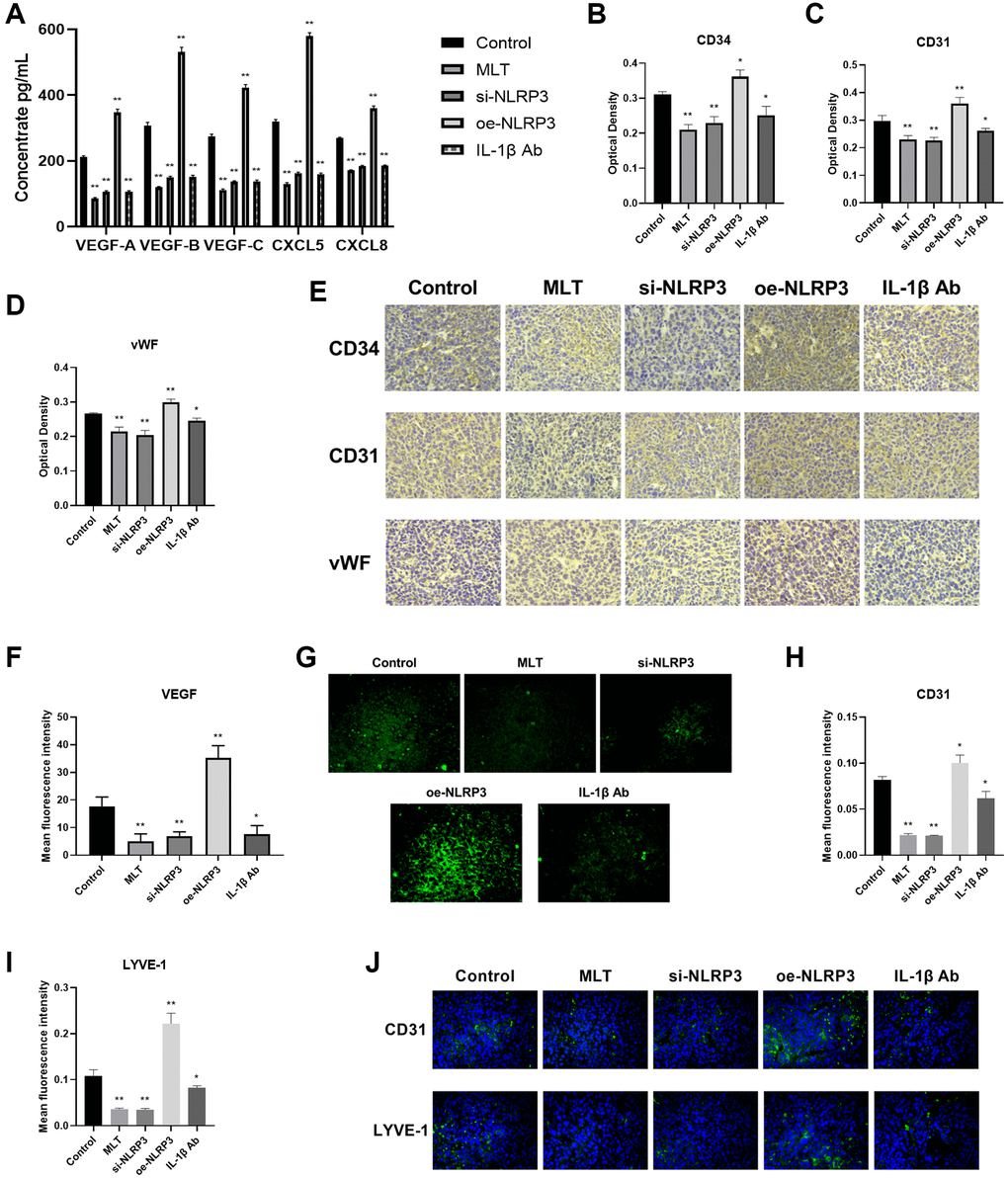 Then, we further investigated the effects of melatonin and the NLRP3 pathway on tumor angiogenesis and lymphangiogenesis. Initially, we evaluated the levels of VEGF-A, VEGF-B, VEGF-C, CXCL5, and CXCL8 in mice serum using ELISA. The study revealed that compared to the control group, the expression levels of these proteins were significantly decreased in the MLT group, si-NLRP3 group, and IL-1β Ab group, while exhibiting opposite trends in the oe-NLRP3 group (Figure 7A). CD34, CD31, and vWF are commonly used vascular marker proteins, and immunohistochemical (IHC) staining of these proteins can detect vascular formation in tumor tissues. Our research found that compared to the control group, the optical density of CD34, CD31, and vWF were significantly reduced in the MLT group, si-NLRP3 group, and IL-1β Ab group, while showing opposite trends in the oe-NLRP3 group (Figure 7B–7E). Furthermore, we conducted immunofluorescence (IF) detection of VEGF in tumor tissues. The findings indicated that the average fluorescence intensity of VEGF was significantly decreased in the MLT group, si-NLRP3 group, and IL-1β Ab group, while showing opposite results in the oe-NLRP3 group (Figure 7F, 7G). CD31 and LYVE-1 serve as markers for neovascularization and lymphangiogenesis, respectively. IF detection of tumor tissues was also performed for these markers. Consistent with previous results, we observed a significant decrease in the average fluorescence intensity of CD31 and LYVE-1 in the MLT group, si-NLRP3 group, and IL-1β Ab group, while demonstrating opposite trends in the oe-NLRP3 group (Figure 7H–7J).