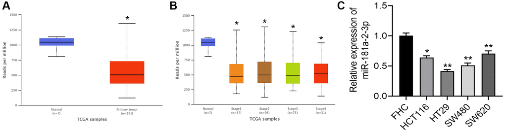 We analyzed miR-181a-2-3p expression in colon cancer tissues based on the TCGA database, and the results showed that miR-181a-2-3p was lowly expressed in colon cancer tissues (Figure 1A) and miR-181a-2-3p showed low expression in colon cancer tissues at different stages (Figure 1B). Further, we detected miR-181a-2-3p expression in colon cancer cells by qRT-PCR assay, and the results showed that miR-181a-2-3p expression was differentially low in colon cancer cell lines (HCT116, HT29, SW480, and SW620) relative to colon epithelial cells FHC (Figure 1C).