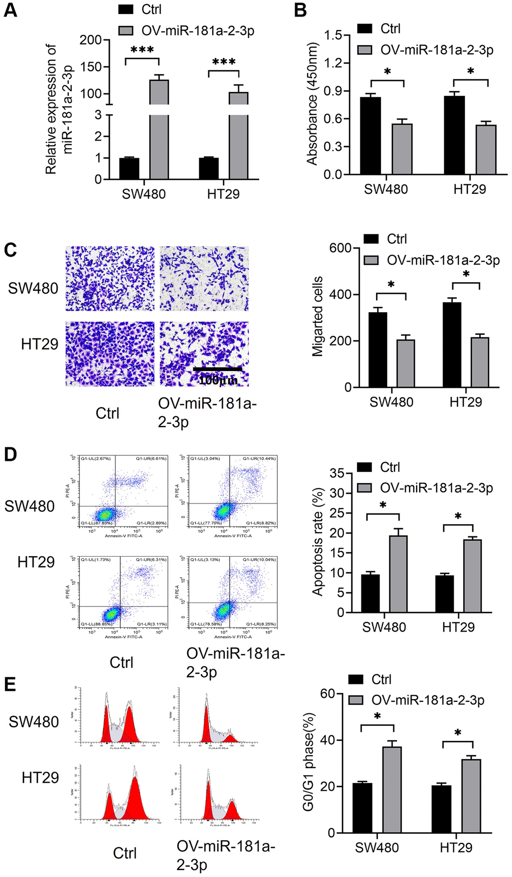 We constructed a model of miR-181a-2-3p overexpression by transfecting miRNA mimics in colon cancer cells SW480 and HT29, and verified the efficiency of miR-181a-2-3p overexpression by qRT-PCR assay (Figure 2A). Next, overexpression of miR-181a-2-3p resulted in a decrease in the proliferative capacity of cells on using the CCK-8 assayCCK-8 assay showed that overexpression of miR-181a-2-3p reduced cell proliferation (Figure 2B). Subsequently, the results of Transwell assay revealed that the number of invasive cells in the miR-181a-2-3p mimics group was significantly lower than that in the normal control (NC) group using the Transwell assay (Figure 2C), indicating that miR-181a-2-3p inhibited the migrative ability of colon cancer cells. We also investigated cell apoptosis and cell cycle by flow cytometry. The results revealed that cell apoptosis (Figure 2D) and G1 phase (Figure 2E) were increased in both SW480 and HT29 cells overexpressing miR-181a-2-3p. However, in the G2 phase (Figure 2E), overexpression of miR-181a-2-3p inhibited cell apoptosis. This may be related to the time process of small RNA overexpression, and we focus on the G1 phase.