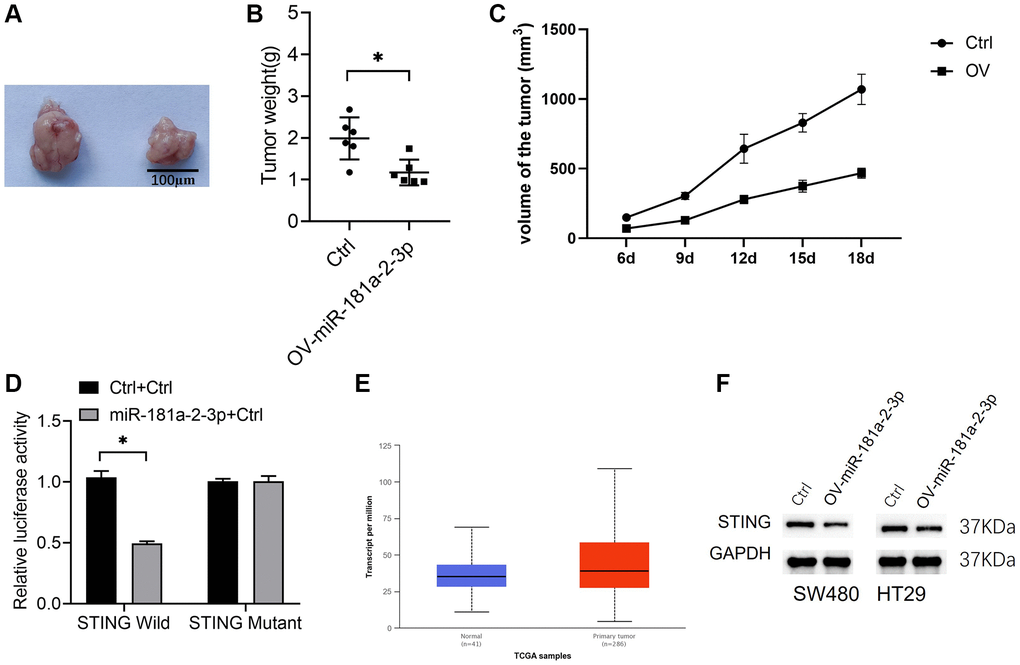 We investigated the effect of miR-181a-2-3p on colon cancer growth in vivo by the tumorigenesis assay in nude mice. The results showed that isolated tumors from the miR-181a-2-3p overexpression group were smaller than those from the Ctrl group (Figure 3A–3C). Also, we found that STING might be a target gene of miR-181a-2-3p (http://mirdb.org/cgi-bin/target_detail.cgi? Target ID = 2267397). Then, we verified the binding effect of miR-181a-2-3p and STING 3′-UTR regions by a dual luciferase assay (Figure 3C, 3D). Meanwhile, we analyzed STING expression in colon cancer tissues based on the TCGA database, and the results showed that STING was overexpressed in colon cancer tissues (Figure 3D, 3E). Moreover, we also performed Western blot analysis examined the expression level of STING expression in colon cancer cell lines overexpressing miR-181a-2-3p by Western blot assay and found that STING protein expression the expression of STING protein was decreased in SW480 and HT29 cell lines overexpressing miR-181a-2-3p (Figure 3E, 3F).