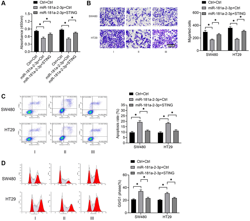 To investigate the role of STING in colon cancer, we simultaneously overexpressed miR-181a-2-3p along with and STING and then detected cell proliferation, migration, apoptosis, and cycle events. The results revealed that STING overexpression significantly reversed the biological effects of miR-181a-2-3p overexpression, including the inhibition of proliferation (Figure 4A) and migration (Figure 4B), the promotion of apoptosis (Figure 4C), and change in the alteration of cell cycle distribution (Figure 4D). These findings suggested that the miR-181a-2-3p/STING axis was involved in the development and progression of colon cancer.