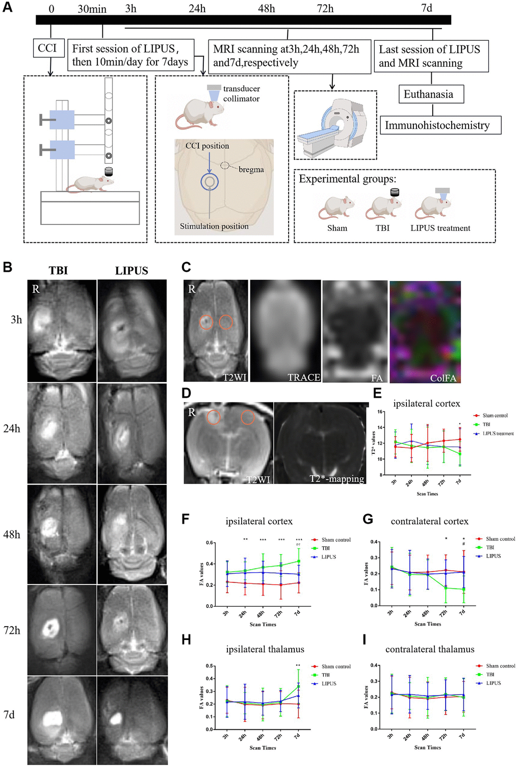 In the TBI group, FA increased from 72 h after trauma; the value was significantly different from that of the sham rats on the 7th day (adjusted P = 0.0025), and the FA value in the LIPUS group increased less than that in the TBI group at 72 h and was also not significantly different from those of the sham and TBI groups (adjusted P = 0.2319, adjusted P = 0.1942) (Figure 1H).