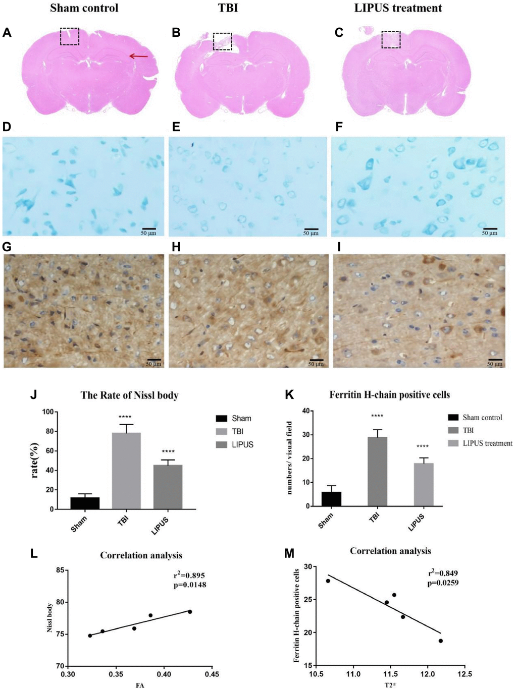 At 7 days after trauma, 5 rats in the TBI group and LIPUS group were randomly selected for Nissl staining, and 3 rats in the sham group were selected. Ferritin staining was performed in the same manner.