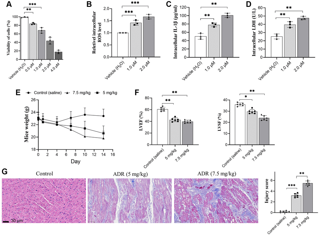The animal study was approved by the animal ethic committee of Baoding No. 1 Central Hospital, and all protocols followed the guideline of the Institutional Animal Care and Use Committee (approval number: K-2023-145). C57BL/6 male mice aged 6–8 weeks were used for in vivo analysis, and two ADR doses (#E2516, Selleck, USA, 5 mg/kg and 7.5 mg/kg) were single injected to tail vein of mice to induce cardiotoxicity in mice. The mice in the control group received physiological saline. Six mice were included in the final analysis. The survival status of mice was observed, and the body weight was recorded every 2 days after injection. All mice were euthanized by decapitation after 14 days of injection for biochemical and pathological analysis.