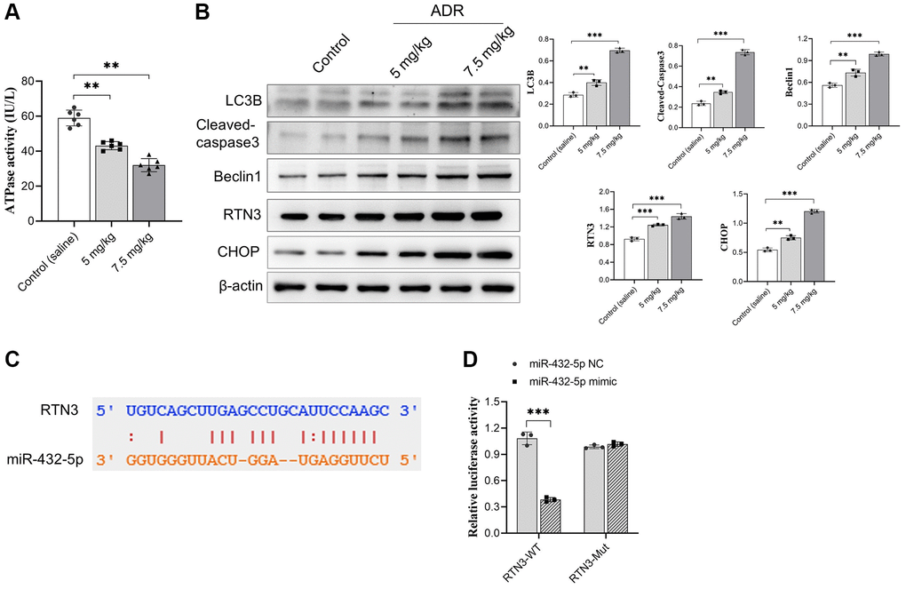We previously reported that miR-432-5p has a protection effect on myocardial infarction through activating Nrf2 pathway by degrading Keap1 via direct interaction [20]. To further explore the possible regulating genes of miR-432-5p, the potential binding genes were screened again. We observed RTN3, a protein which is located into the ER membrane and has potential binding sites with miR-432-5p, and the binding sites was shown in Figure 3A. Next step, the direct binding between miR-432-5p and RTN3 was verified by dual luciferase assay (Figure 3B). Overexpression of RTN3 was reported in the heart injury and was correlated with ER stress, impairment of mitochondria and autophagy. Measurement of ATPase activity also suggested a decrease of mitochondrial energy metabolism in ADR-treated myocardium (Figure 3C). The autophagy marker LC3B, cell apoptosis enzyme cleaved caspase3, autophagy regulatory enzyme Beclin 1, and ER-stress-related transcription factor CHOP had all been increased in ADR-treated heart tissues (Figure 3D).