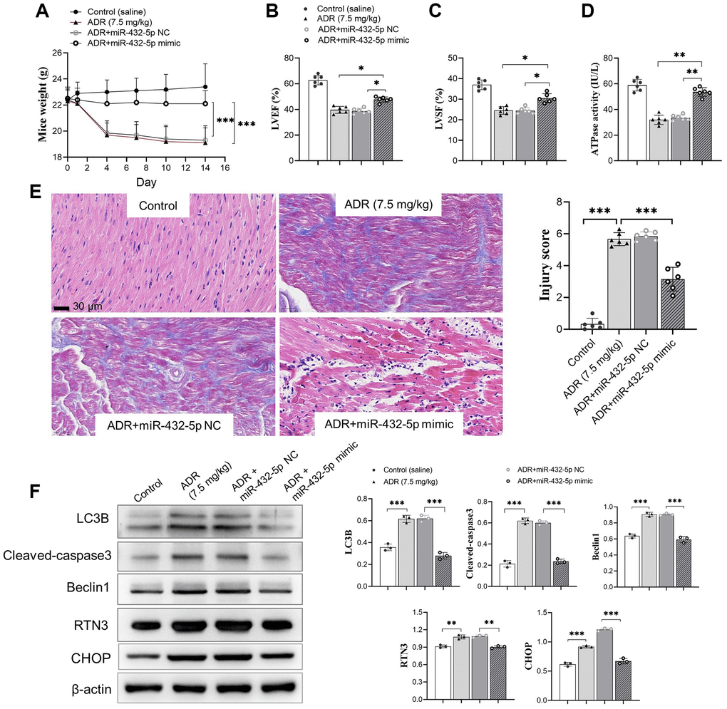 The exogenous miR-432-5p was introduced in ADR-stimulated myocardium. Upregulation of miR-432-5p improves the decreased body weight (Figure 4A) accompanied by improved LVEF, LVSF and activity of ATP synthesis (Figure 4B–4D) in ADR-treated mice. The immunohistochemical staining demonstrated that the injury caused by ADR was improved by miR-432-5p (Figure 4E). Autophagy is activated in cells that receive various stimuli (or stresses). LC3 (microtubule-associated-proteinlight-chain-3) forms autophagosome-encapsulated degradation products and is transported to lysosomes for degradation. LC3B is an LC3 isotype and a marker of myocardial tissue damage [21]. Cleaved caspase3 and Beclin 1 are important apoptosis marker of cells [22, 23]. We measured the above important markers in tissues. Exogenous increasing miR-432-5p in ADR-treated mice decreased protein expression of LC3B, cleaved caspase3, Beclin 1, and RTN3 (Figure 4F), which suggested that exogenous increasing miR-432-5p could reduce ER stress, apoptosis and autophagy.