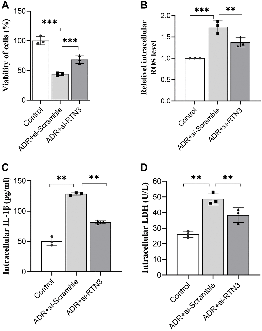 After stimulated by ADR, cells lysis regent (P0013, Beyotime, China) was put on ice for 30 minutes. The lysed solution was centrifuged for 12000 r/min for 15 minutes in 4°C, and the supernatant was collected to measure the ROS level (#CA1410, Solarbio Inc.), intracellular IL-1β (#SEKM-0002, Solarbio Inc.) and LDH (#BC0685, Solarbio Inc.) according to the protocols provided by the manufacturer.