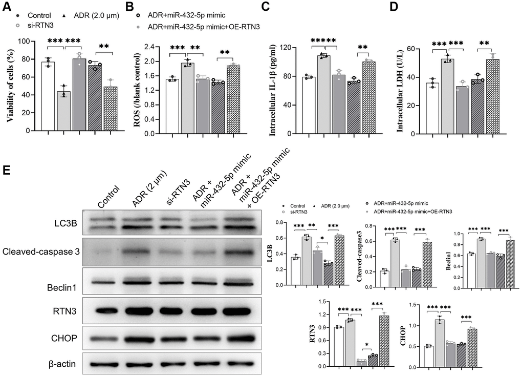 To verify the detrimental role of RTN3 on ADR-induced heart injury, we silenced RTN3 in the primary cardiomyocytes. Compared with scramble siRNA control, knocking down RTN3 significantly increased cell viability, and reduced the production of ROS and LDH, which demonstrated that RTN3 significantly contributed to the ADR-induced toxicity to cardiomyocytes (Figure 5A–5D). Next step, we verified whether the effect of miR-432-5p decreasing ADR induced toxicity is relying on RTN3. Compared with cardiomyocytes treated by ADR, si-RNT3 and the miR-432-5p mimic attenuate ADR-induced toxicity while could not attenuate the toxicity when RTN3 was over-expressed (Figure 6A–6D); which was confirmed by western blot analysis when RTN3 was upregulated along with partial upregulated expression of LC3B, cleaved-caspase3, Beclin1 and CHOP in cardiomyocyte (Figure 6E).