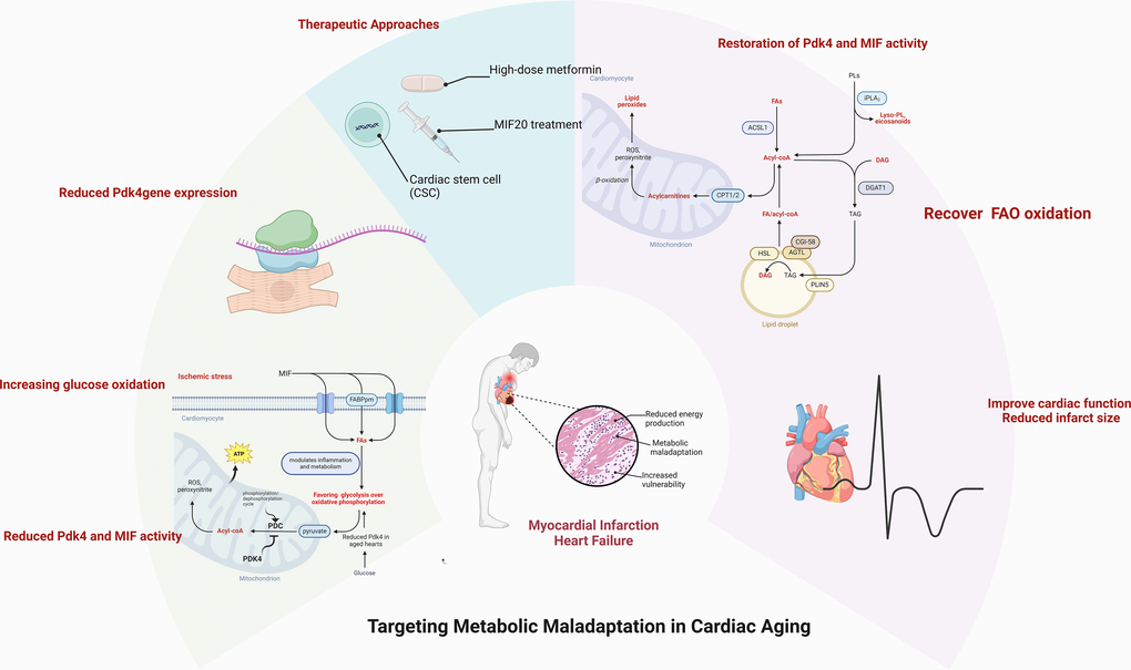 The interplay between Pdk4 and MIF in the aging heart provides a nuanced understanding of metabolic dysregulation post-MI. Targeting Pdk4 to restore efficient energy production through FAO and using MIF agonists to enhance adaptive responses represent promising therapeutic avenues. Ongoing research focuses on developing pharmacological agents that can precisely modulate these pathways. Such treatments have the potential to revolutionize post-MI care, particularly in elderly patients, by addressing the root causes of metabolic dysfunction and improving cardiac resilience to ischemic stress.