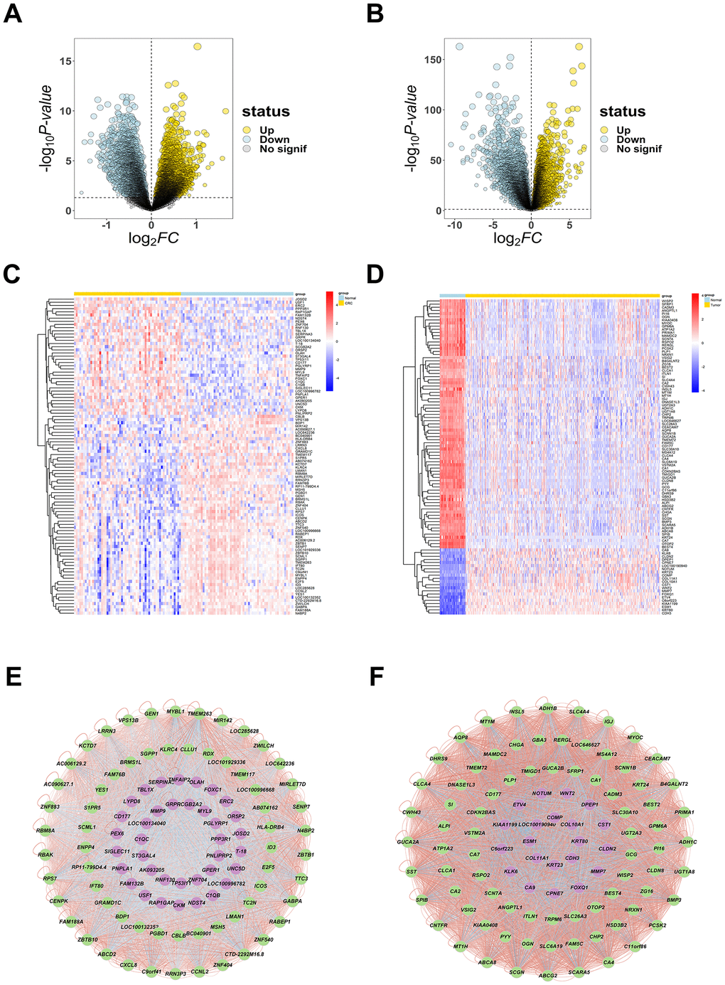 We obtained expression data separately from Gene Expression Omnibus (GEO) and The Cancer Genome Atlas (TCGA) databases. GSE164191 was obtained from the GEO database (http://www.ncbi.nlm.nih.gov/geo/) and includes expression profiles of 59 CRC peripheral blood samples and 62 normal peripheral blood samples. Limma package [26] was used to check raw gene expression data. Volcano plots of CRC VS Normal were created to indicate significantly up- and down-regulated genes. Genes with adjusted p-value less than 0.05 were screened and considered as Differential Expression Genes (DEGs). The top 100 DEGs obtained from the above process were used for further studies. Heatmap of the dataset was plotted using SRplot (https://www.bioinformatics.com.cn/) and network of DEGs was plotted using Cytoscape.