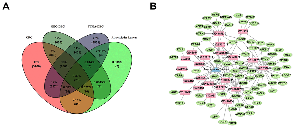 Using “colorectal cancer” and “colorectal adenoma” as search terms, we searched the GeneCards [23], OMIM [24] and DigSee [25] databases for potential targets which related to CRC. Targets from these three disease databases were combined and duplicate values were removed to obtain CRC related targets.