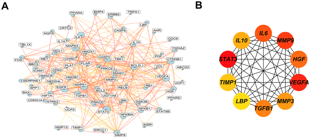 The overlapped targets were submitted to STRING for PPI network construction, and the interacting proteins with a score cutoff > 0.4 and size cutoff < 10 were selected. Finally, 304 interaction relationships were collected and visualized by Cytoscape (Figure 3A). By using Cytohubba, the plug-in of Cytoscape, the hub genes were displayed in the interaction network. The top 10 hub genes of target proteins were identified, and a network was constructed. We found that STAT3, VEGFA, MMP9, IL6, HGF, TGFB1, MMP3, IL10, TIMP1, LBP were the important targets for Atractylodes lancea to intervene CRC (Figure 3B).