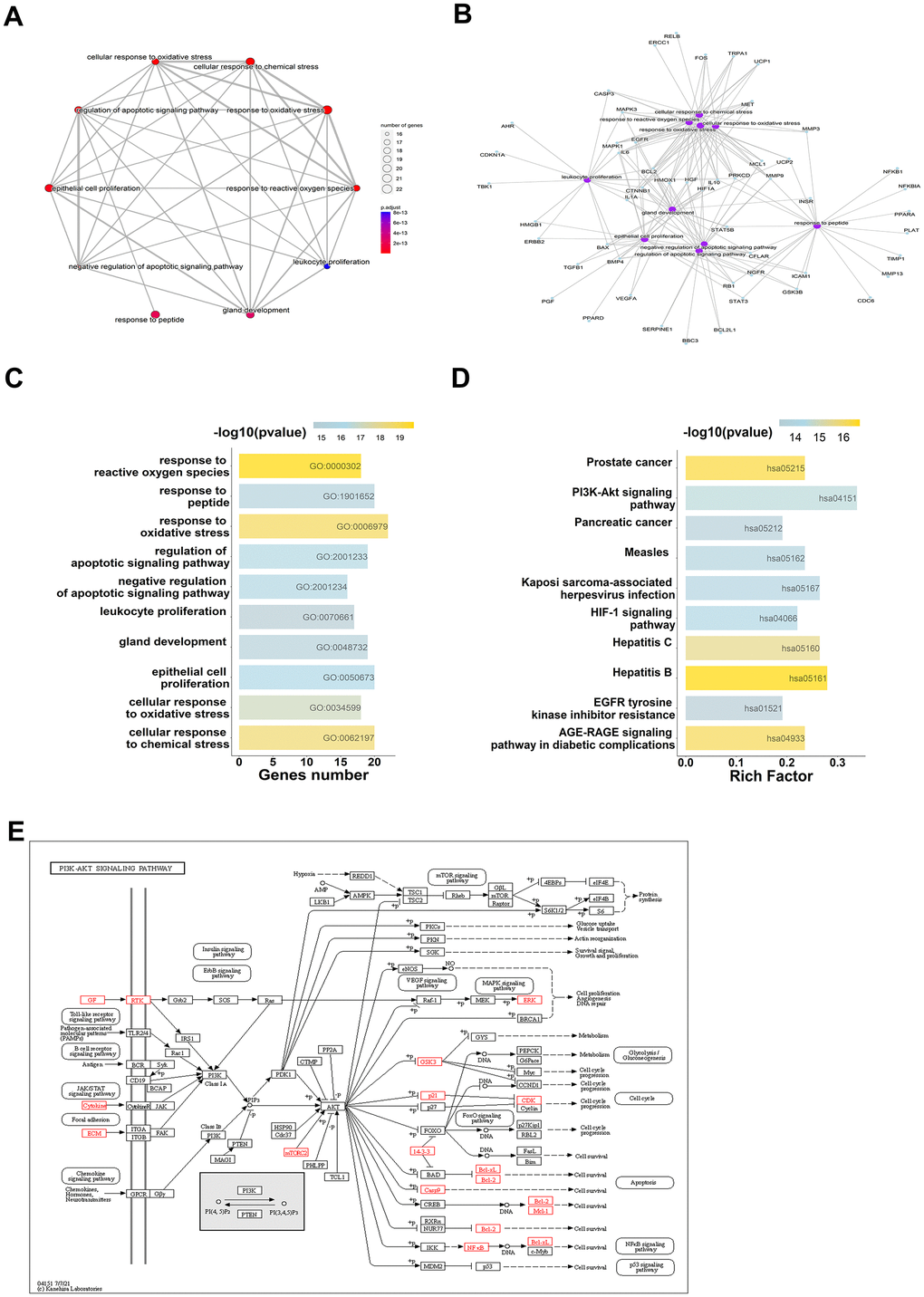Additionally, the molecular function mainly involved identical protein binding, ubiquitin protein ligase binding, protein binding, protein kinase binding, RNA polymerase II sequence-specific DNA binding transcription factor binding, BH3 domain binding, protein homodimerization activity, cytokine activity, enzyme binding and transmembrane receptor protein tyrosine kinase activity (Supplementary Figure 1B). There were 144 KEGG enrichment items in total, and the top 10 items were displayed according to p-values < 0.05 (Supplementary Table 9), included Hepatitis B, Prostate cancer, AGE-RAGE signaling pathway in diabetic complications, Hepatitis C, PI3K/AKT signaling pathway, HIF-1 signaling pathway, Kaposi sarcoma-associated herpesvirus infection (Figure 4D, 4E). Among them, the highest number of intersections genes were enriched in PI3K/AKT signaling pathway. From the enrichment study, Atractylodes lancea may exert its anti-cancer activity through PI3K/AKT signaling pathway.