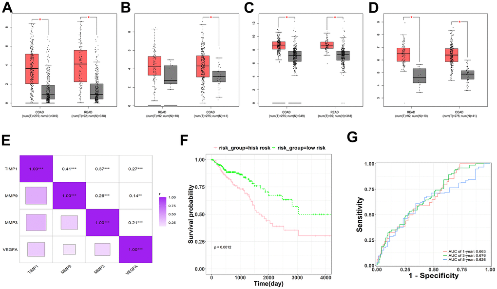 To verify the expression of hub-genes in CRC, it was found that MMP3, MMP9, VEGFA, and TIMP1 were significantly differentially expressed in colorectal tumor, compared with normal tissue (Figure 5A–5D). And correlation analysis revealed that all four genes, MMP3, MMP9, VEGFA, and TIMP1, were significantly positively correlated, suggesting that these genes may have synergistic regulatory effects (Figure 5E). The prognostic risk model was constructed using MMP3, MMP9, VEGFA, and TIMP1, and the following formula was obtained: risk score = -0.09264*MMP3 - 0.06919*MMP9 + 0.44883*TIMP1 - 0.04962*VEGFA. In order to evaluate the clinical prognosis of the disease, Kaplan-Meier (KM) and ROC curve analysis was used, and the results showed that the prognostic model composed of MMP3, MMP9, VEGFA, and TIMP1 could effectively predict the prognostic risk of the patients (Figure 5F, 5G).