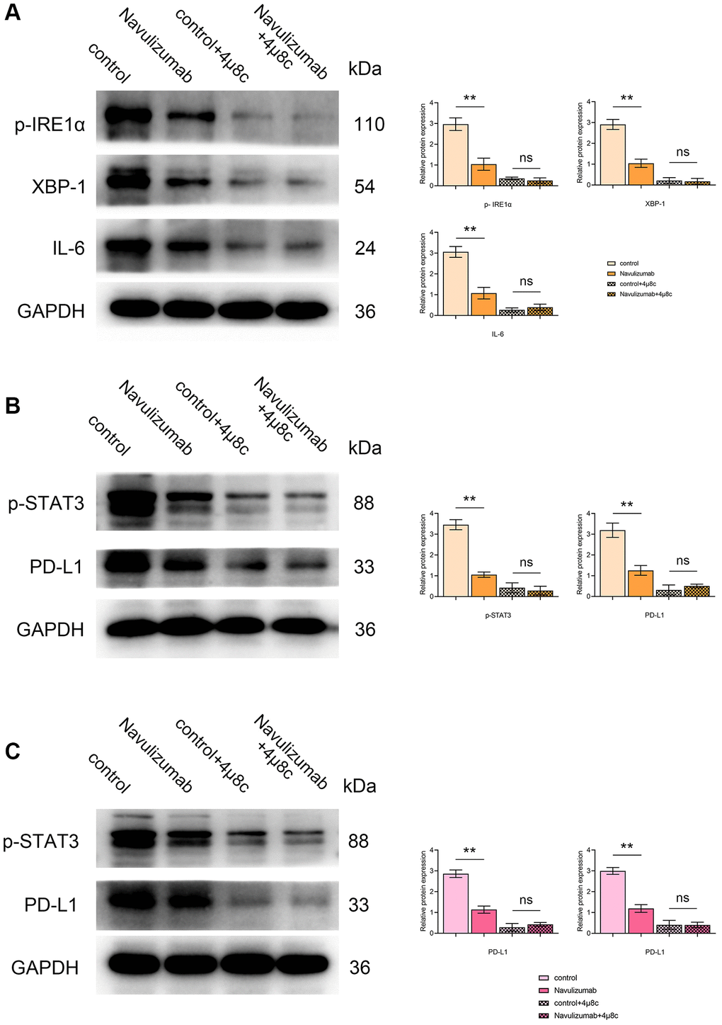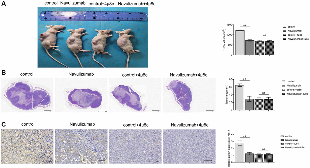The findings of the experiment revealed that the size of the tumor was considerably small in the animals that underwent nabulizumab intervention as compared to the control animals; however, no variation was seen in animal groups with IRE1α inhibitor treatment, as shown in Figure 1A below. HE staining results revealed that the tumor was largest in the control group, and smaller in the nabulizumab intervention group and in the two groups administered with IRE1α inhibitor in the NSCLC model of mice; in Figure 1A, the raw data of the gene expression are presented and in Figure 1B the final quantification of the results appears. Analysis of the data obtained from histochemical staining indicated that the indexes of P-IRE1α and XBP-1 were the highest in the control group and lesser in the nabulizumab intervention group, and both indexes were lower in the two groups that added 4 μ8c; the results are shown in Figure 1C.