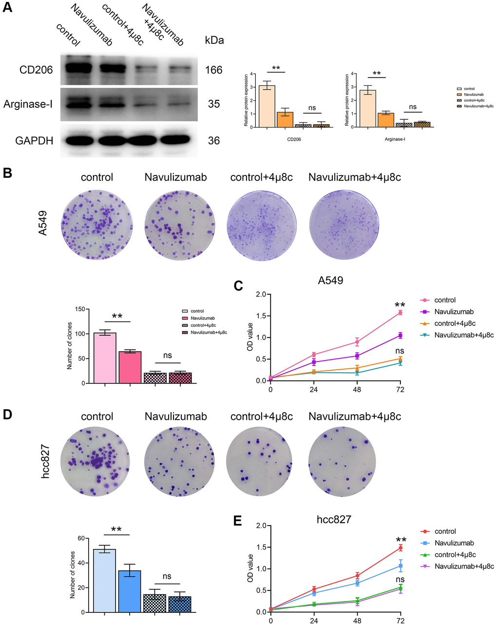 A total of 32 8-12-week-old 129Sv/Ev homozygous female mice and 8-12-week-old C57BL/6 female mice were purchased from Henan Skibbes Bio-technology Co. Ltd (License No. SCXK (Yu)). All the animal studies were carried out in compliance with the protocols approved by the Institutional Animal Care and Use Committee (IA-CUC) of Fudan University (C2117250220 and C2020-0005). Lung cancer cells A549, Hcc827 cells and macrophages THP-1 were obtained from the Cell Bank of type C proast no of China, SBICAS (Shanghai Institute for Biological Science). Fetal bovine serum and RPMI 1640 medium were transported from Biyuntian Biotechnology Co., Ltd; nabulizumab and 4 μ8c inhibitor were purchased from Sidi Pharmaceutical Co. Ltd.; 4% paraformaldehyde fixative and crystal violet staining were purchased from Golden Clone Beijing Solepol Co. Ltd.; Western blot kits were purchased from Shanghai Xinyu Biotech Co. Ltd.; cell counter, 6-well culture plate, cell culture incubator and protein blotting system were purchased from Hangzhou Kerabo Biological Instrument Co.