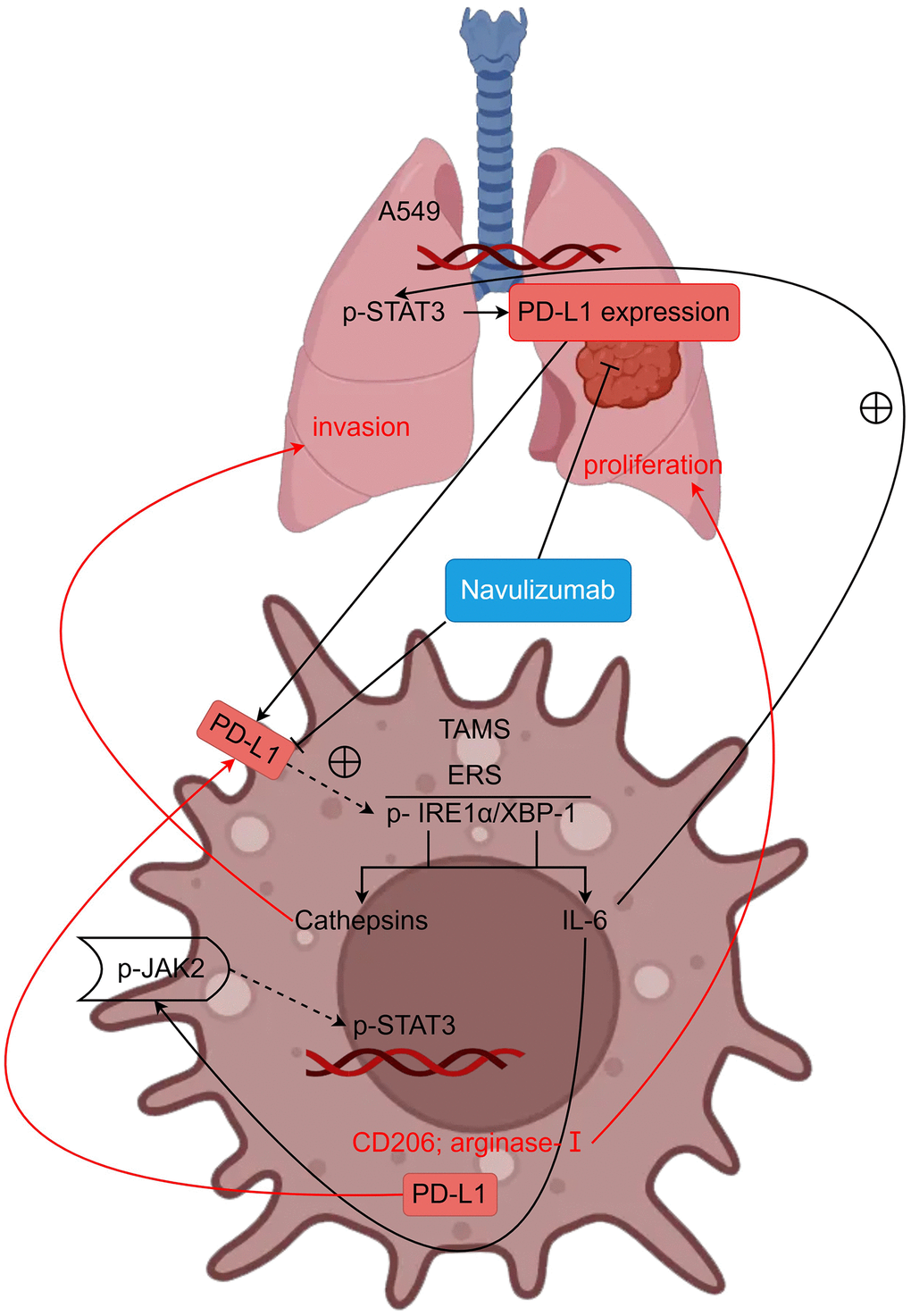 A detailed study of the role of tumor-associated macrophages (TAMs) in the immunosuppressive function within tumors proposed that ER stress is critical for retention of the TAM population and modulating the ER. It is well understood that unfolded protein response (UPR) can control three unique proteins which are, y inositol-requiring enzyme 1 (IRE1), activating transcription factor 6 (ATF6), and protein kinase RNA-like to keep its inactive or bound to their membrane with GRP78/BiP. In this study, we mainly focus on inositol-requiring enzyme 1 (IRE1). IRE1 alpha is a homodimeric type I membrane protein which is resident in the lumen of the endoplasmic reticulum. After the activation of UPR, IRE1 alpha, self-dimerization and self-phosphorylation guarantee its activation (phospho-Ser7). After the above process, unfolded proteins accumulate to produce endoplasmic reticulum stress (ERS), and XBP-1 can directly bind to the promoter of the macrophage IL-6 gene to exert its effects, leading to overexpression of IL-6. IL-6 can act on JNK2 to phosphorylate P-STAT3, it also leads to production of CD2O6, Arginase-I, and PD-L1 that supplies nutrition to tumors contributing to its growth. CD2O6 and Arginase-I are reported to operate in non-small cell lung cancer cell and that they enhance their proliferation. TAMs secrete PD-L1 and the IL-6 generated by TAMs fosters P-STAT3 in non-small cell lung cancer and therefore honed PD-L1 in non-small cell lung cancer. Therefore, the PD-L1 produced by both the TAMs and the non-small cell lung cancer impact the TAMs cells. PD-L1 can also phosphorylate IRE1α, thereby promoting the action of the cysteine protease Cathepsins, which invade non-small cell lung cancer.