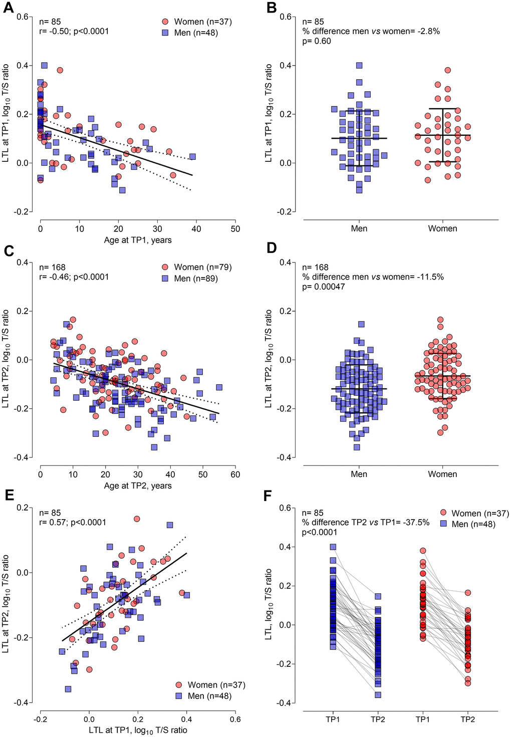 LTL decreased with chronological age at TP1 and TP2 (Figure 1A, 1C, respectively). Each year increment was associated with –1.22% (95% CI: –0.74 to –0.33%; P<0.001) shorter LTL at TP1, and with –0.93% (95% CI: –1.20 to –0.65%; P<0.001) shorter LTL at TP2. At TP1 women did not show a difference in LTL compared with men but showed longer LTL in the study group at TP2 (Figure 1B, 1D, respectively). At TP2 women had 10.5% (95% CI: 4.0 to 17.4%; P=0.0015) longer LTL compared to men, after age adjustment. LTL showed a clear tracking in 85 CF patients between TP1 and TP2 as shown by the LTL correlation within the same subjects (r=0.57, P<0.001; Figure 1E). LTL ranged from 0.77 to 2.51 in blood samples at TP1 and from 0.44 to 1.46 in samples at TP2, resulting in a significantly lower LTL at TP2 compared with TP1 (P<0.001). This difference was comparable for men and women as shown in Figure 1F.