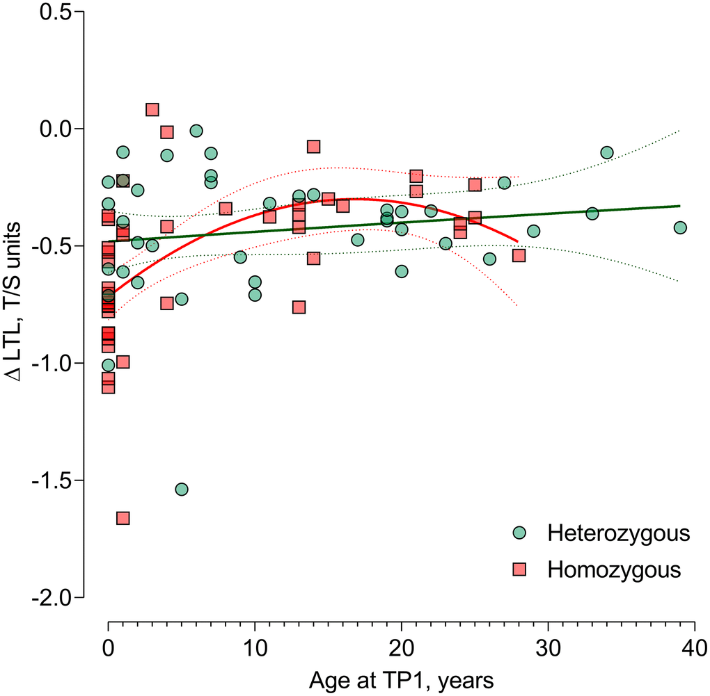 | Estimates presented with 95%CI representing the association between ΔLTL (LTL at TP2 minus LTL at TP1, in T/S ratio) and age at TP1 for each year increment at different ages (1, 5, and 17 years, based on 25th, median, and 75th percentile of the age distribution). Models adjusted for sex and time between samples within an individual. P-interaction between the quadratic term of age at TP1 and genotype (p=0.044), reflecting the genotype-specific non-linear LTL attrition-age association. In total 44 patients were homozygous for the ΔF508 mutation and 41 were heterozygous. | |||||||||||||||||||||||||||||||||||||||||||||||||||||||||||||||||||||||||||||||||||||||||||||||||||