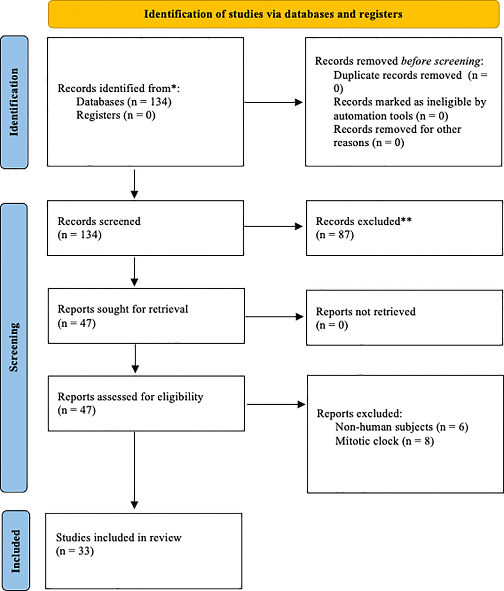 The initial search resulted in 134 articles. After abstract screening, 87 articles were excluded. After full-text screening, 14 articles were removed. This yielded 33 included studies. Included studies featured a variety of biological clocks, including methylation-based clocks, mortality clocks, and phenotypic clocks. Table 1 presents the characteristics and performance of all the included clocks in our study.