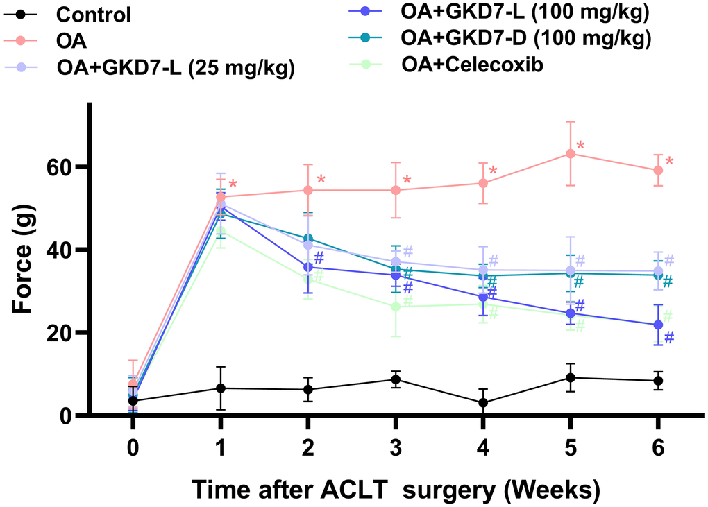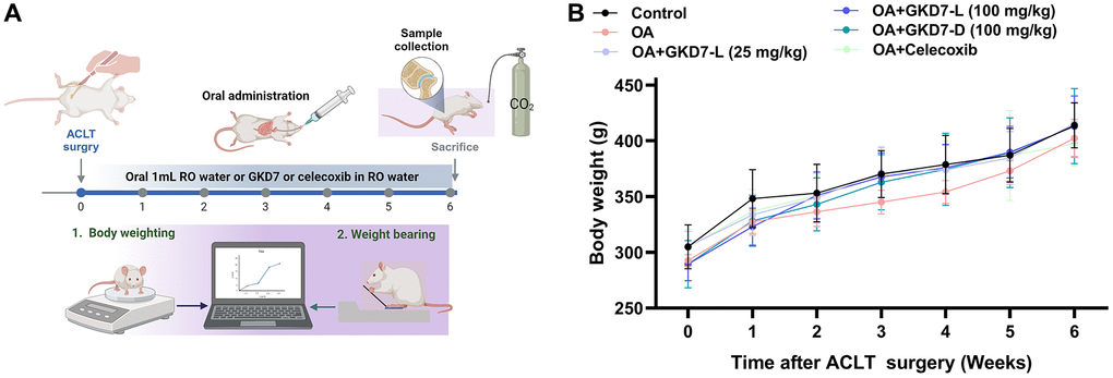 Eight-week-old Sprague Dawley (SD) rats (300–350 g) were supplied by LASCo Inc. (Taipei, Taiwan) and maintained in an animal center under the Institutional Animal Care and Use Committee (IACUC) Guidelines issued by China Medical University (approval number: CMUIACUC-2023-283). Anterior cruciate ligament transection (ACLT) or sham surgery followed the procedures described in previous studies [26–28]. And rats were randomly divided into six groups: (1) sham operation without treatment (Control); (2) ACLT without treatment (OA); (3) OA treated with GKD7-L (25 mg/kg), GKD7-L (100 mg/kg), GKD7-D (100 mg/kg), and OA treated with celecoxib (50 mg/kg). GKD7 and celecoxib were administered orally five days per week. GKD7 and celecoxib, specifically, were taken orally five days a week. In all four research groups, the rats received 1 milliliter (ml) of reverse osmosis (RO.) water as a supplement beginning two days following surgery. In the ACLT-treated groups GKD7-L (at levels of 25 and 100 mg/kg) and GKD7-D were added to the RO. water for oral administration for six weeks. Furthermore, during the same six-week period, celecoxib (at a dose of 50 mg/kg) was dissolved in the RO. water and administered orally, except for the ACLT group that did not receive treatment. After 6 weeks, the rats were sacrificed.