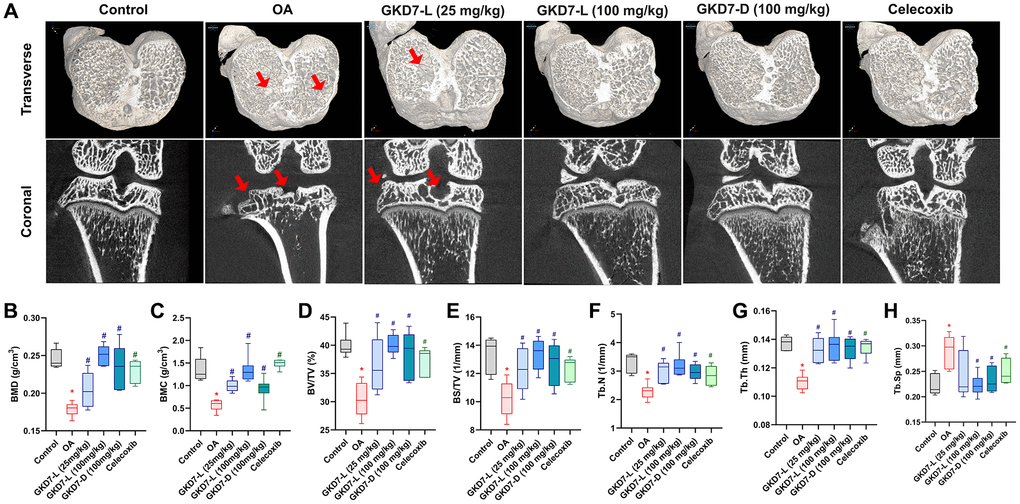 In clinical and pre-clinical trial, the micro-CT evaluation is a powerful tool for diagnosing OA [38, 39]. As a result, we collected a rat knee sample for micro-CT imaging and analysis. The micro-CT images of the OA group clearly display bone loss (Figure 3A). Following ACLT-induced bone resorption, oral treatment of GKD7-L (25 and 100 mg/kg), GKD7-D (100 mg/kg), and celecoxib all show a reduction in obvious bone erosion with a significant difference on parameter analysis of micro-CT images (Figure 3B–3H). As a result, GKD7-L and GKD7-D administration at various doses and formulations stops bone degradation on ACLT-induced OA.