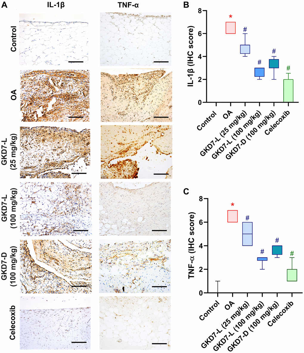 OA is a chronic inflammatory disease which affects the pain behavior, synovial inflammation, and cartilage degradation [1, 2, 11, 12, 41, 42]. The proinflammatory cytokines, such as IL-1β and TNF-α, have important roles for mediating the progression of OA which cause joint pain, promote inflammatory response, and disturb chondrocyte metabolism of OA [11, 12, 41, 43]. Moreover, the clinical data which were reported in previous literatures indicated that there are significant higher levels of IL-1β and TNF-α which were expressed on synovial tissue and serum of OA patients [12, 27, 44]. In pre-clinical trial, IL-1β and TNF-α are also important targets to discover the useful therapeutic strategy for OA [12, 45, 46]. In present study, our data show that oral administration of GKD7-L (25 or 100 mg/kg), and GKD7-D (100 mg/kg) both effectively reduced IL-1β and TNF-α expression with reducing synovial inflammation. Although our previous study already demonstrated that administration of GKD7-L can slow down the progression of OA, in this study, GKD7-D also show the same effectivity with reducing synovial inflammation via IL-1β and TNF-α inhibition. Thus, GKD7 can apply to different applications for different dosage forms for OA treatment.
