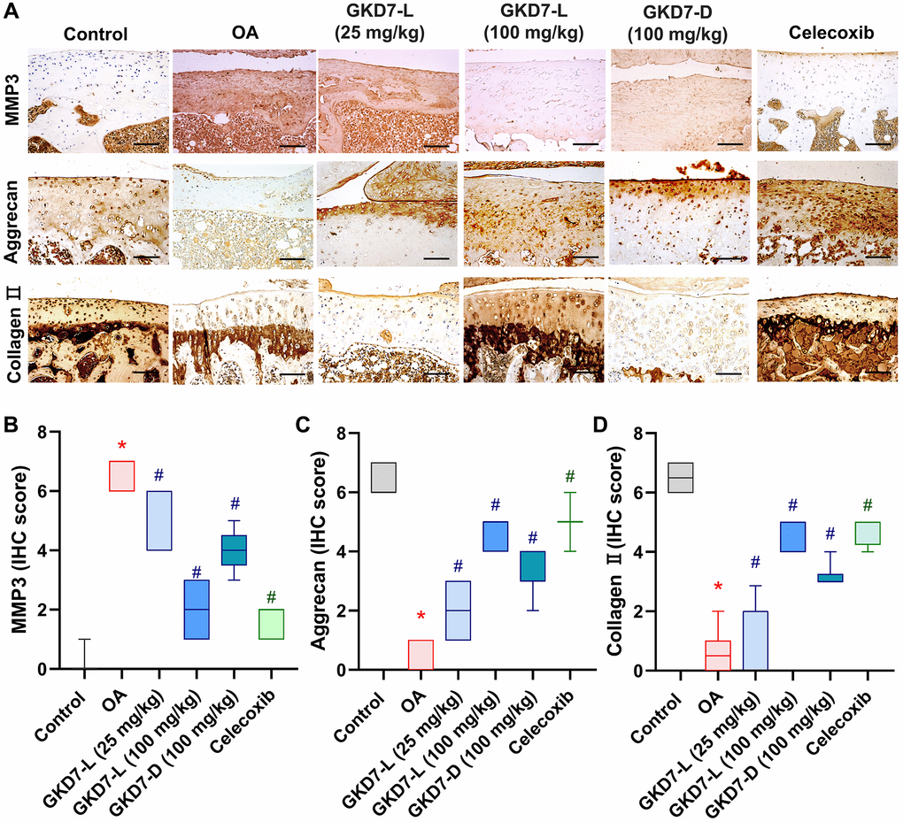 Previous studies have highlighted that IL-1β and TNF-α are major proinflammatory cytokines involved in OA. And these cytokines disturb chondrocyte metabolism by suppressing the synthesis of extracellular matrix proteins and stimulating the release of catabolic proteases. And MMP3 also have been reported as the as an activator for several other pro-MMPs and initiates MMP-mediated degradation reactions in OA. Thus, we propose that GKD7 can down-regulate MMP3 expression via reducing TNF-α, IL-1β expression on OA joint [47, 48]. For further investigation of the therapeutic effects of GKD7, our different dosage and dosage forms of GKD7 were all shown to significantly improve the OA pain and histopathological characteristic with inhibiting MMP3, IL-1β, and TNF-α expression to reverse collage II and aggrecan degradation in OA. These results suggest that GKD7-L and GKD7-D both as supplements can be used to improve OA progression and based on the same dosage (100 mg/kg) treatment, GKD7-L show more effective improving function. Higher dosage of GKD7 also show the similar therapeutic effects as the positive control celecoxib. Therefore, we suggest that GKD7 is a useful supplementation to serve as an alternative to celecoxib to avoid adverse effects.