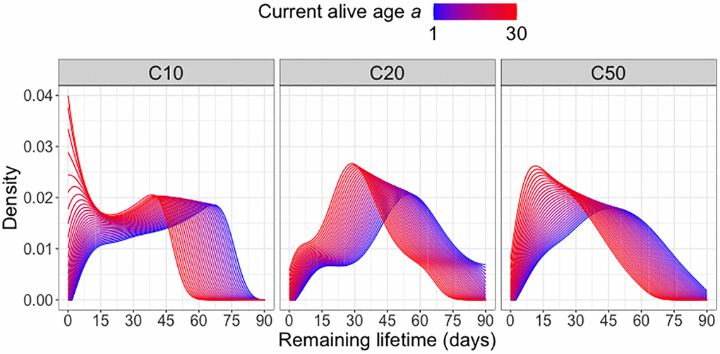 Predicting the exact remaining lifetime for an individual still alive at a specific age a is futile due to the high random variation of individual age-at-death. A more feasible target is to predict the distribution of remaining lifetime for an individual alive at age a. We demonstrate this by demonstrating the effect of diet by predicting the distribution of remaining lifetime with Fréchet regression (see Appendix) for individuals in each of the diet groups C50, C20 and C10, where the predicted distribution of remaining lifetime is conditional on an individual still being alive at age a, where a varies. Of course, the larger the value of a, the more compressed the remaining lifetime distribution is, as remaining lifetime is becoming shorter with increasing age a.