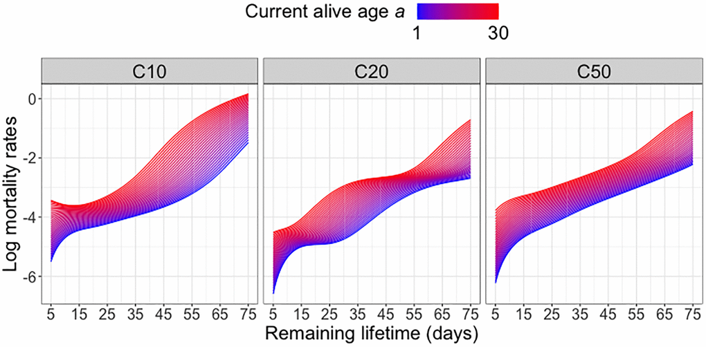 Predicted remaining lifetime distributions can be equivalently visualized as mortality rate (force of mortality, hazard function). Hazard functions can be derived from the density functions of the remaining lifetime distributions or alternatively directly estimated from lifetable data, with proper adjustments for right tail estimation [27, 28]. Figure 2 illustrates that, as expected, the mortality risk (represented by higher values of the log hazard function) increases with increasing current age alive a for all diet groups. Across all diet groups, higher ages alive a are associated with elevated mortality risk at all subsequent ages, in line with expected increased mortality risk in older populations. Among the three diet groups, the C10-fed medflies are subject to the highest mortality risk at older ages a, while the C20-fed medflies are seen to have a relatively lower mortality risk. However, the overall patterns of mortality risk across diet groups do not show substantial differences.