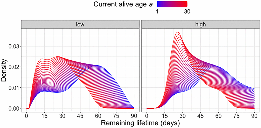 Focusing on the diet group C20, which according to Figure 2 is associated with the lowest mortality risk, we further examine the effect of current alive age a on the remaining lifetime distribution when also adjusting for the overall movement activity from time 0 until age a. Within each cohort surviving beyond age a, we classify the subjects into “high” (above median) or “low” (below median) activity groups and implement global Fréchet regression (see (2) in the Appendix) with the remaining lifetime distribution as response and predictors a and activity group (coded as an indicator variable). Figure 3 indicates a movement of the density peak towards the left and upward with increasing currently alive age a that is more pronounced for the “high” activity group, which means there is a higher immediate death rate for this group. With increasing age a, the densities tend to have higher and sharper peaks, followed by a steadier decline. The global Fréchet regression models are fitted using the R function GloDenReg in the frechet package [29].