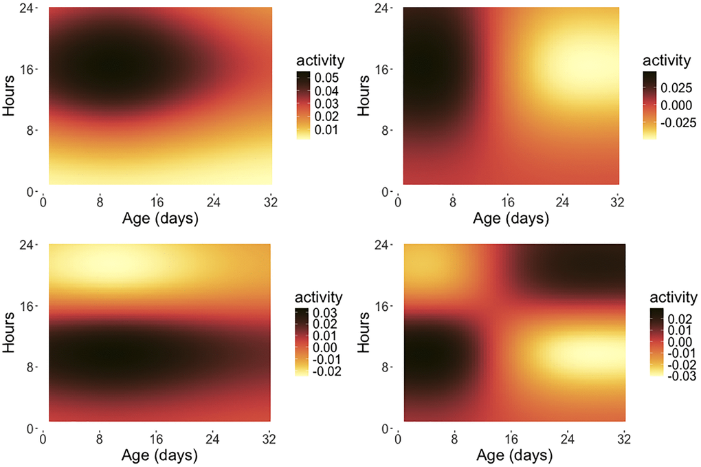 The eigenfunction products delineate the main modes of variation for these processes, decomposing the total variation into interpretable components. Here the first eigenfunction surface ϕ1(t)ψ1(s) (upper left) illustrates a contrast between movement activity early (0–8 am) and late in the day (after 8 am), with diminishing contrast at older ages. The second eigenfunction surface ϕ2(t)ψ1(s) (upper right) highlights a contrasting pattern between activity at early and late ages (before and after 12 days), while the third eigenfunction surface ϕ1(t)ψ2(s) (bottom left) shows another contrast that divides the intra-day functions into periods before and after 4 pm. The fourth eigenfunction surface ϕ2(t)ψ2(s) (bottom right) emphasizes a reversal of the contrast between early and late activity at younger ages (before 4 pm until age 15 days) and late activity at older ages (after 4 pm beyond age 15), but overall does not explain much of the variation. Using the functional principal component scores for this product approach, one can further investigate the relationship between remaining lifetime and activity patterns; see [6] for more details. Implementations of these methods are available in the R package fdarep [33] via functions Dense2dFPCA and DenseProductFPCA.