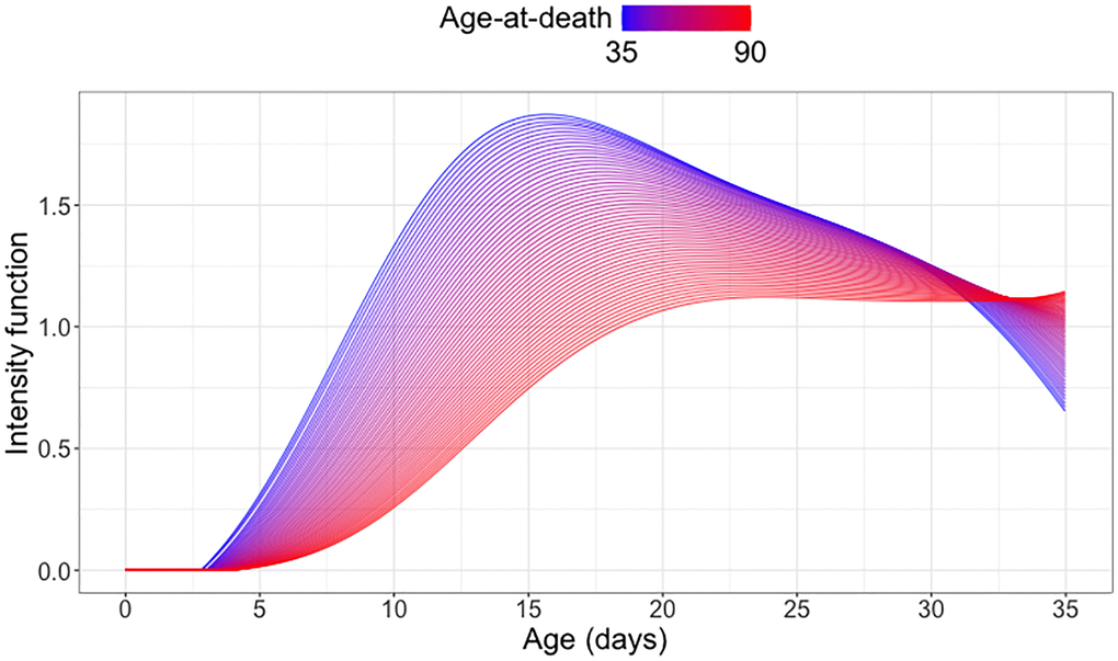 Figure 6 shows a distinct association between egg count trajectories and age at death. For medflies with lower age-at-death, the daily egg count tends to peak sharply around 15 days, with a steady decline thereafter. Flies who survive longer tend to have relatively lower egg counts at all ages until 30 days, and especially at younger ages, coupled with enhanced reproductive activity beyond 30 days after emergence. This pattern reflects the observed cost of reproduction for female medflies.