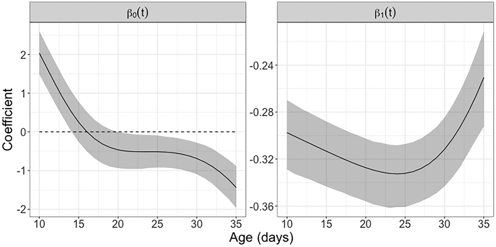 To fit the varying coefficient model and obtain the 95% bootstrap pointwise confidence bands, we used the functions ConcurReg and GetCI Sparse, available in the R package fdaconcur [40].