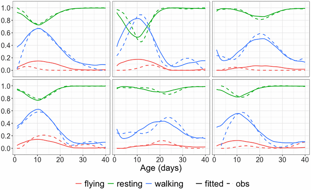 In a preprocessing step, the three behaviors were transformed into proportions per time unit, where the proportions always sum up to 1 and are non-negative, thus forming compositional data; for example, 80% resting, 10% flying and 10%walking during one hour of observations, reflecting the observed proportions in time among just these three behaviors (other behaviors are not considered). We then obtained square-root transformed compositional proportions