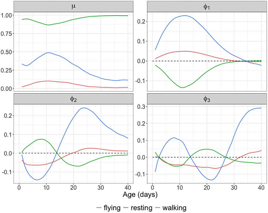 The first three eigen components explain more than 96% of the total variation. The first eigenfunction reflects an overall contrast between resting and moving (flying or walking) throughout the observation period. The second eigenfunction reflects a contrast between early (0–15 days) and late (16–40 days) age periods, while the third eigenfunction features a contrast for both resting and walking between the middle age period (15–25 days) and the early/late age periods. Invoking modes of variation through this approach facilitates a comprehensive analysis of complex, time-varying behavioral patterns.