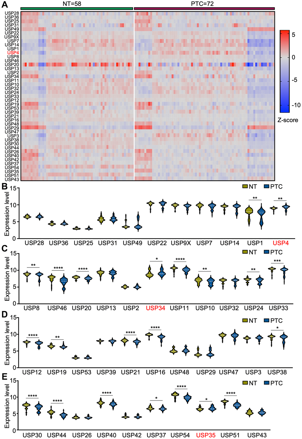 To elucidate the potential roles of USP genes in PTC tumorigenesis and progression, we analyzed the expression levels of 43 USP genes using four GEO databases (GSE3467, GSE6004, GSE33630, and GSE76039) (Figure 1A). In total, 58 normal thyroid tissues and 72 PTC tissues were included in the analysis. Compared with normal thyroid tissues, 19 genes exhibited significant downregulation in PTC tissues, while USP4, USP34, and USP35 showed significant upregulation (Figure 1B–1E). As one of the key members of the USP family, the function and molecular mechanisms of USP4 in PTC have yet to be elucidated. Therefore, in this study, USP4 was selected as the focus of our investigation.