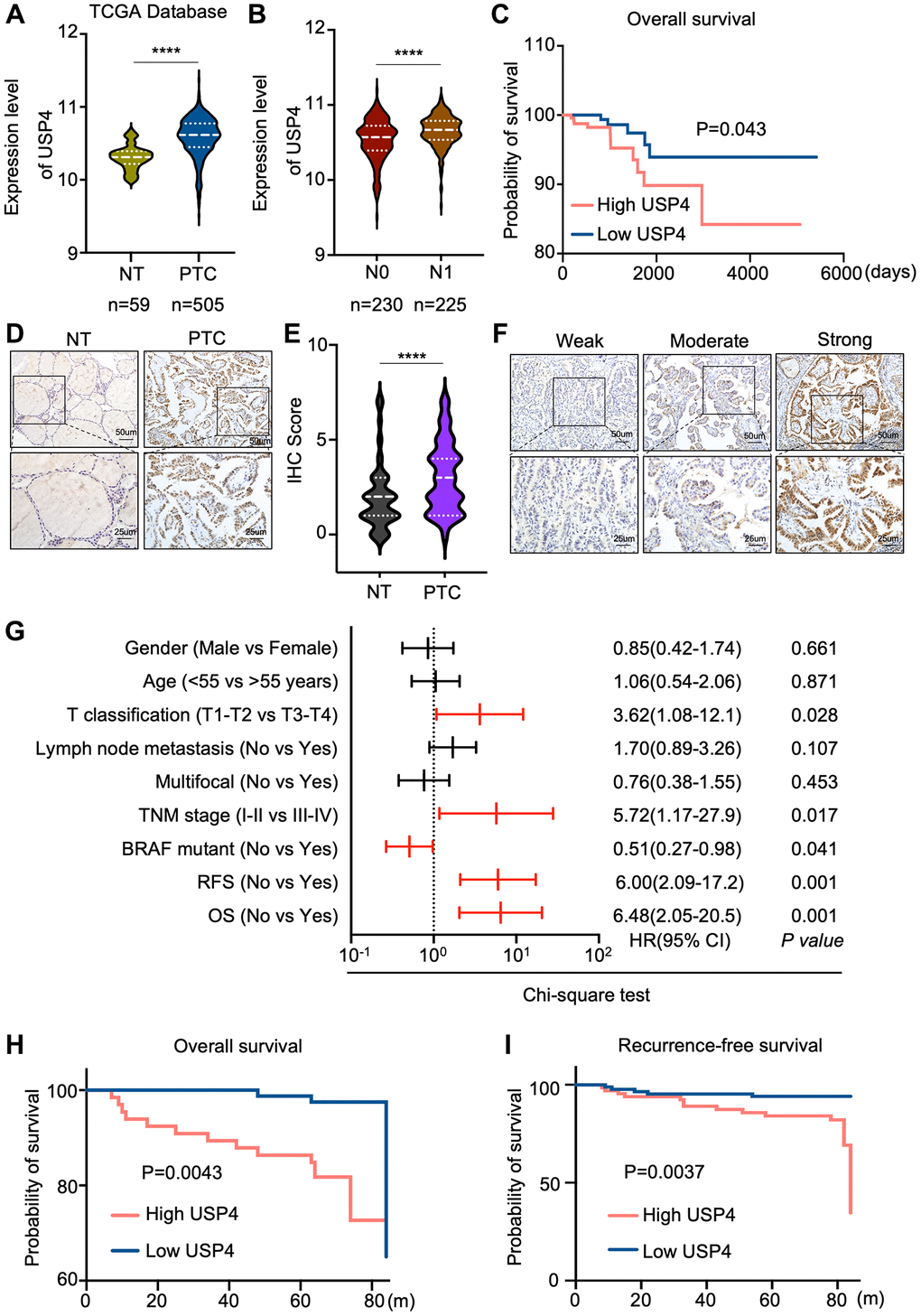 To corroborate these findings, we performed immunohistochemical (IHC) analysis on a cohort of 151 PTC patients. The results underscored a significant increase in USP4 expression in PTC tissues compared to corresponding adjacent normal thyroid tissues (Figure 2D, 2E). Moreover, univariate logistic regression analysis based on USP4 expression levels in PTC revealed a strong correlation with T stages, TNM stages, BRAF mutation status, recurrence-free survival, and overall survival (Figure 2F, 2G). Additionally, Kaplan-Meier analysis demonstrated a significant association between higher USP4 expression levels and shorter overall survival (OS) and recurrence-free survival (RFS) in PTC (Figure 2H, 2I). These comprehensive findings further underscore the clinical significance of USP4 as a potential prognostic marker in PTC.