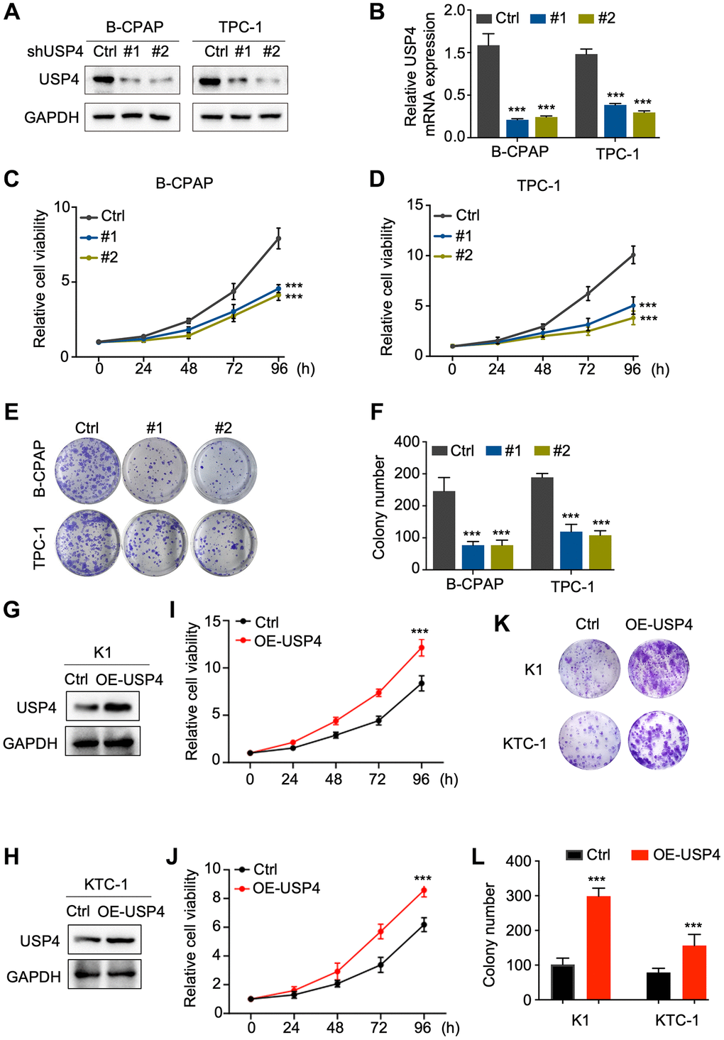 To investigate the potential impact of USP4 on the biological behavior of PTC cells, we knocked down USP4 expression in B-CPAP and TPC-1 cells. Western blot analysis and qPCR were performed to assess knockdown efficiency, revealing significant reductions in USP4 protein and mRNA levels (Figure 3A, 3B). Furthermore, the CCK-8 assay demonstrated that USP4 knockdown significantly inhibited the proliferation of both B-CPAP and TPC-1 cells (Figure 3C, 3D). Moreover, the colony formation assay indicated that USP4 knockdown significantly reduced colony number in both B-CPAP and TPC-1 cells (Figure 3E, 3F). Finally, to further elucidate the role of USP4 in PTC, we overexpressed USP4 in K1 and KTC-1 cells (Figure 3G, 3H). CCK-8 and colony formation assays demonstrated that USP4 overexpression promotes PTC cell proliferation (Figure 3I–3L).