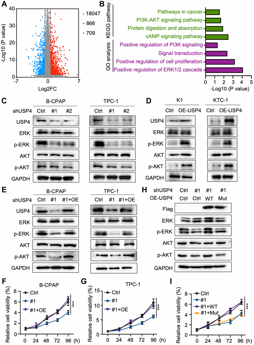 To elucidate the molecular mechanisms by which USP4 influences PTC tumorigenesis, we screened for differentially expressed genes associated with high and low USP4 expression in PTC patients using the TCGA database. The analysis identified 866 significantly upregulated genes and 709 significantly downregulated genes (Figure 4A). Global pathway analysis indicated significant enrichment in the “positive regulation of the ERK1/2 cascade” and the “PI3K-AKT signaling pathway” (Figure 4B). Subsequently, we verified the influence of USP4 on the MAPK and AKT signaling pathways by Western blot analysis. The results demonstrated that USP4 knockdown significantly reduced levels of phosphorylated ERK and phosphorylated AKT, whereas USP4 overexpression significantly elevated these levels (Figure 4C, 4D). Meanwhile, we investigated the functional role of USP4 mediated by the MAPK and AKT signaling pathways. The results indicated that USP4 overexpression in PTC cells, where USP4 was originally knocked down, significantly reversed the inhibition of the MAPK and AKT signaling pathways (Figure 4E). Concurrently, CCK-8 and colony formation assays showed that USP4 overexpression in USP4-knockdown cells significantly rescued USP4-mediated effects on cell proliferation (Figure 4F, 4G and Supplementary Figure 1A, 1B). Furthermore, to investigate the role of USP4’s deubiquitination activity, we engineered USP4-knockdown cells to express either wildtype USP4 or a deubiquitination-deficient mutant (C311A). The results demonstrated that wildtype USP4, but not the C311A mutant, reversed the inhibition of MAPK and AKT signaling pathways (Figure 4H). Additionally, CCK-8 assay revealed that wildtype USP4, in contrast with the C311A mutant, restored PTC proliferation (Figure 4I). In conclusion, USP4 promotes PTC progression through the MAPK and AKT pathways, contingent upon its deubiquitination activity.