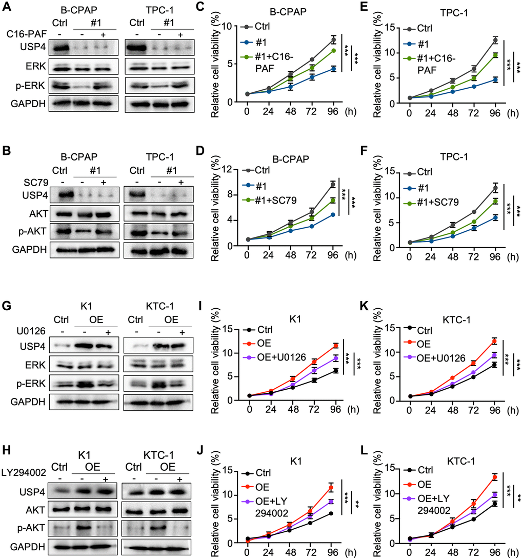 To further explore the roles of MAPK and AKT signaling pathways in the molecular regulation through which USP4 modulates PTC cell tumorigenesis. Initially, we activated the MAPK and AKT signaling pathways in USP4-knockdown cells using C16-PAF and SC79, respectively (Figure 5A, 5B). CCK-8 and colony formation assays demonstrated that C16-PAF and SC79 partially reversed the proliferation inhibition induced by USP4 knockdown (Figure 5C–5F and Supplementary Figure 2A–2D). Additionally, we treated USP4-expressing cells with U0126 and LY294002, inhibitors of the MAPK and AKT signaling pathways, respectively (Figure 5G, 5H). CCK-8 and colony formation assays showed that U0126 and LY294002 significantly mitigated the proliferation effects induced by USP4 overexpression (Figure 5I–5L and Supplementary Figure 2E–2H). In summary, these findings indicate that USP4 promotes PTC progression partially through the MAPK and AKT signaling pathways.