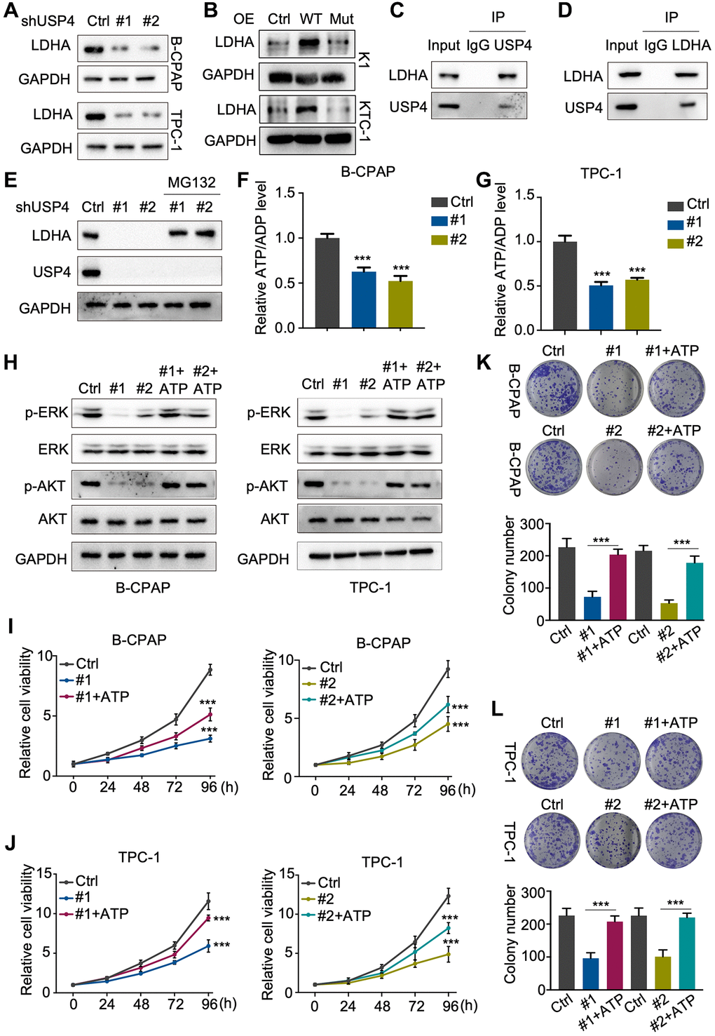ATP has been reported to activate the MAPK and AKT signaling pathways in various systems. Subsequently, we verified the regulatory mechanism of USP4 on the MAPK and AKT signaling pathways using Western blot analysis. The results demonstrated that USP4 knockdown significantly decreased the levels of phosphorylated ERK and phosphorylated AKT, which could be rescued by ATP (Figure 6H). Furthermore, CCK-8 and colony formation assays (Figure 6I–6L) demonstrated that ATP restored the proliferation inhibition due to USP4 knockdown. In summary, our results indicate that USP4 promotes PTC progression through the stabilization of LDHA.